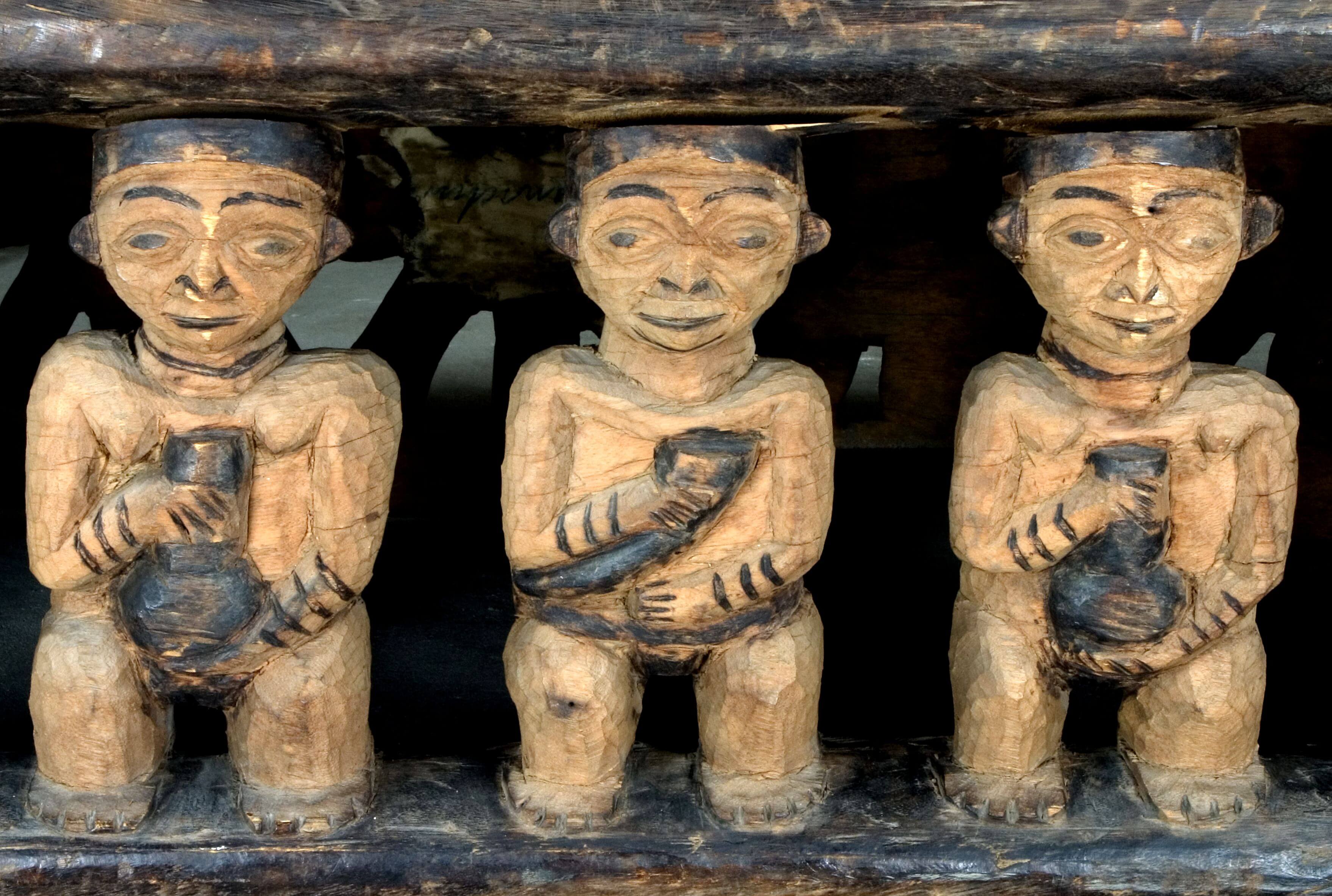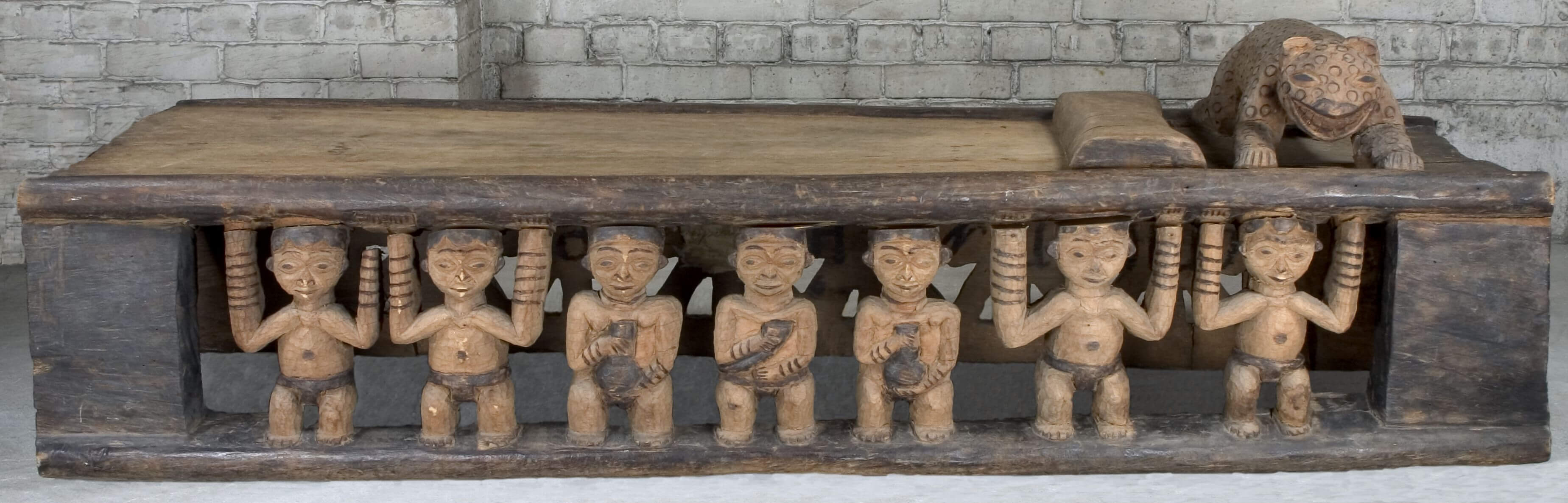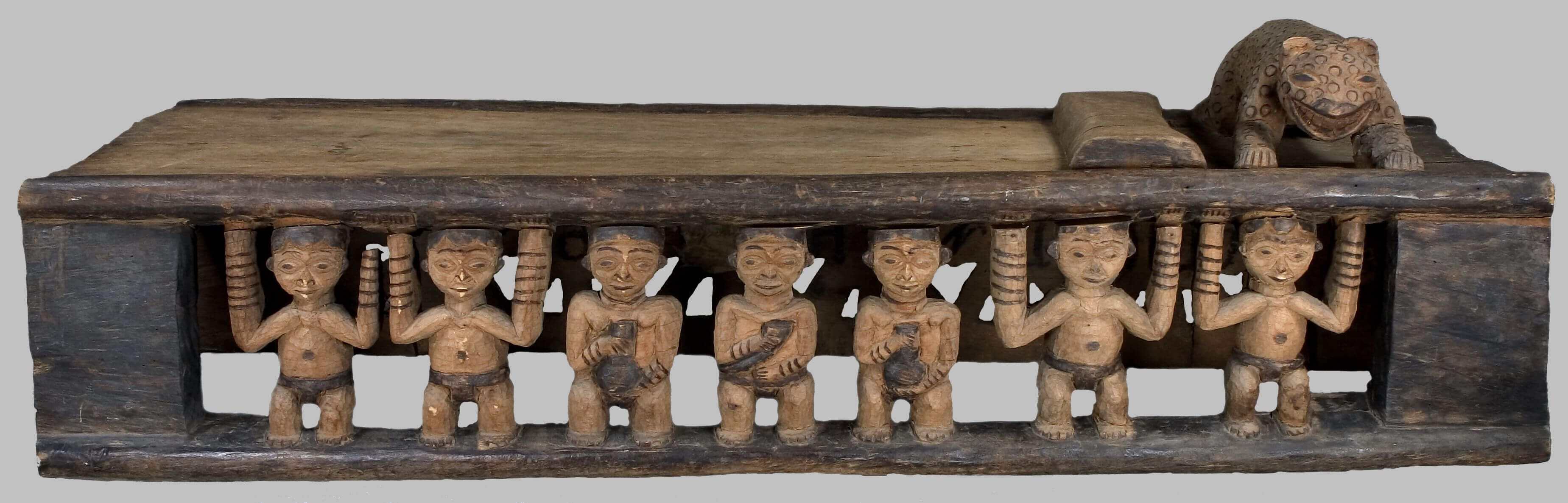 | Description | Zum persönlichen Besitz des Fon/Königs und Inventar des Palasts gehörte dieses Bett. Vor 1909, in der Zeit als Strümpell das Bett in Besitz nahm, regierte Asèh Yufanyi, der selbst Schnitzer war (Harter 1992: 182). Ob der König dieses Bett schnitzte oder einer seiner Handwerker ist heute schwer zu sagen. Mitunter ging die Urheberschaft an den König über, auch wenn er selbst die Arbeit nicht durchführte. (Sein Nachfolger Phonchu Asèh regierte von 1910-1918 und war ebenfals Schnitzer) Beschreibung auf der alten Karteikarte: "Aus einem Stück gearbeitetes hölzernes Bett. Am Kopfende ein vollrund ausgeschnittener Puma, auf der einen Seite als tragende Figuren in der Mitte der Häuptling, rechts und links von ihm zunächst seine Weiber mit Palmwein, dann die Großen des Reiches. Auf der anderen Seite stilisierte Schildkröten (?). (Die Seitenteile sind, um den Transport zu ermöglichen, abgesägt.)" Mit "Schildkröten" war das in der Ikonografie des Kameruner Graslands verbreitete Spinnenmotiv gemeint. Die Kopfstütze wird durch einen Leoparden gebildet, dessen Darstellung den Schnitzern des königlichen Hofes vorbehalten war. Mit dem Trinkhorn wurden Trankopfer für die Ahnen dargebracht und zeichneten als Attribut den Fon oder Notabeln aus. Die beiden Frauen neben dem Notabeln mit Trinkhorn halten Palmweinbehälter (Kalebassen) in den Händen, während weitere vier Diener des Königs die Liegefläche stützen. Chr. Geary 1983, S. 157 f. Nr. 16, Abb. 39 zeigt ein Vergleichsobjekt. |