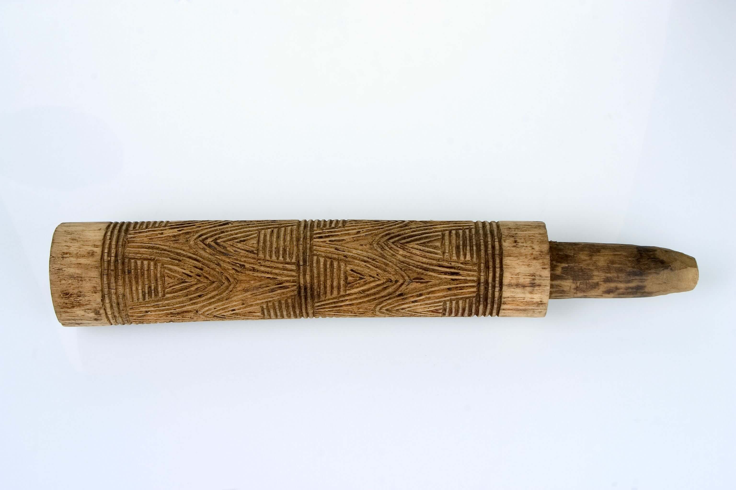 | Description | Pfeifenrohr aus Holz. Nach der alten Karteikarte ist A III c 354 f ohne Zinnfolie. Es sind jedoch einige wenige Reste von Zinnfolie erkennbar sowie Reste einer roten Färbung. Die Schreibweise der kulturellen Zuschreibung variiert in den Quellen; auf den alten Karteikarten im Museum wird überwiegend die Bezeichnung "Bangua" verwendet. |