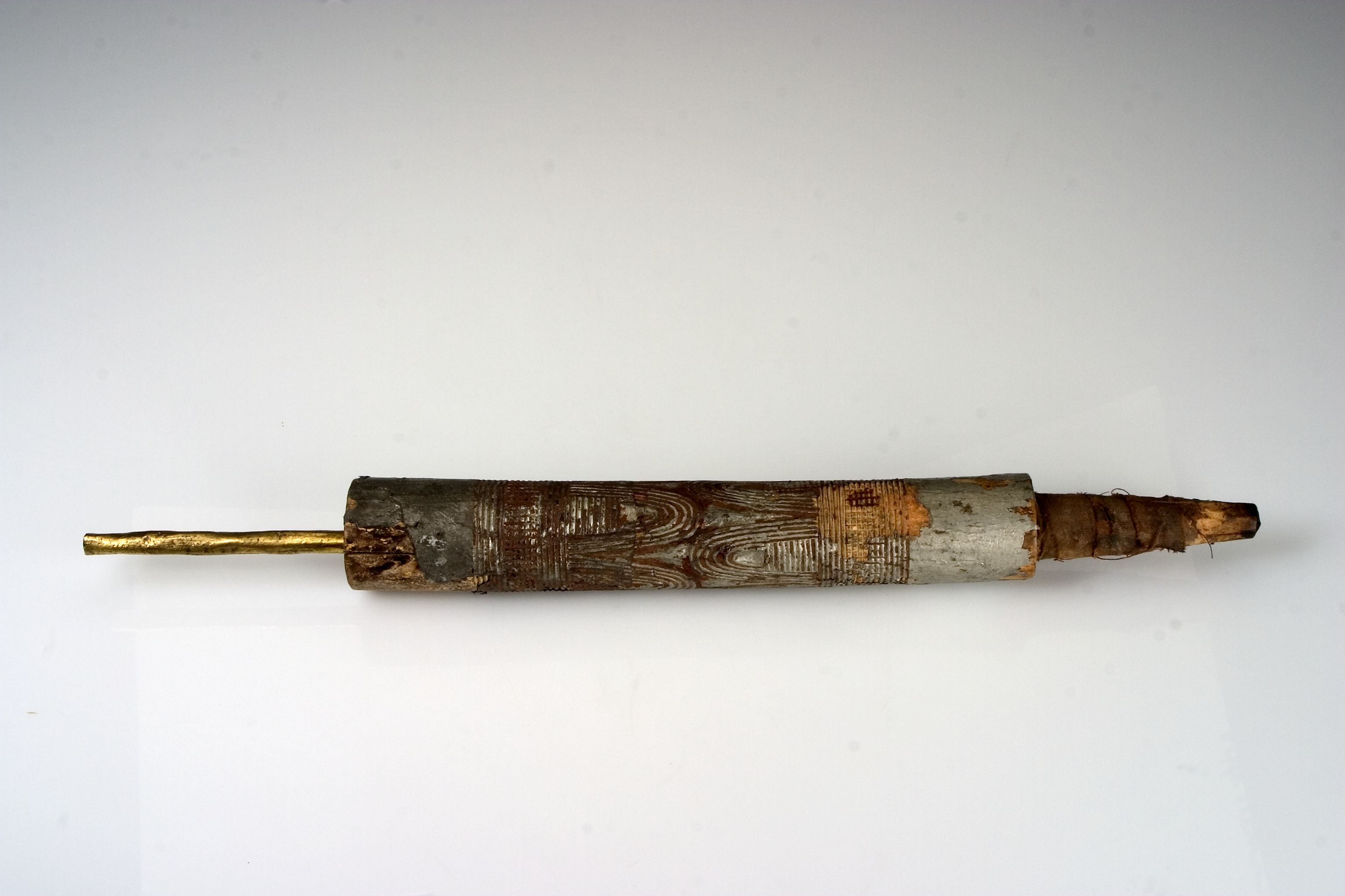| Description | Pfeifenrohr aus Holz mit Mundstück aus Messing, von Zinnfolie umgeben. Die Zinnfolie, die in den Vertiefungen rot gefärbt ist, bröckelt stark ab. |