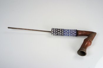 | Description | Pfeifenkopf aus rotem Ton mit geometrischen Mustern verziert. Zwischen Tonkopf und kupfernem Mundstück ist ein Bereich, der mit Glasperlen in Weiß und verschiedenen Blautönen verziert ist. Die Perlen sind auf Textil gefädelt, mit dem dann das Holzrohr ummantelt wurde. |