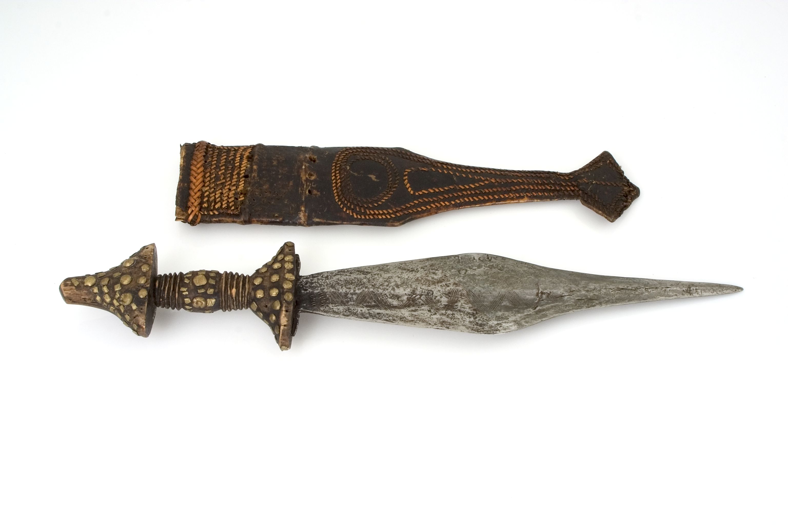 | Description | Beschreibung auf alter Karteikarte: "Messer mit Scheide von Badju (Tai Badju) Eisenklinge, spitz verlafend, in der Mitte am breitesten. Holzgriff mit Messingnägeln beschlagen. Lederscheide aus Antilopenfell." Die Schlaufen aus "Antilopenfell" fehlen |