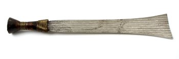 | Description | Schwert mit breiter mehrfach gerillter Klinge, Holzgriff mit Messingdraht umwickelt, oben 5 Messingnägel |