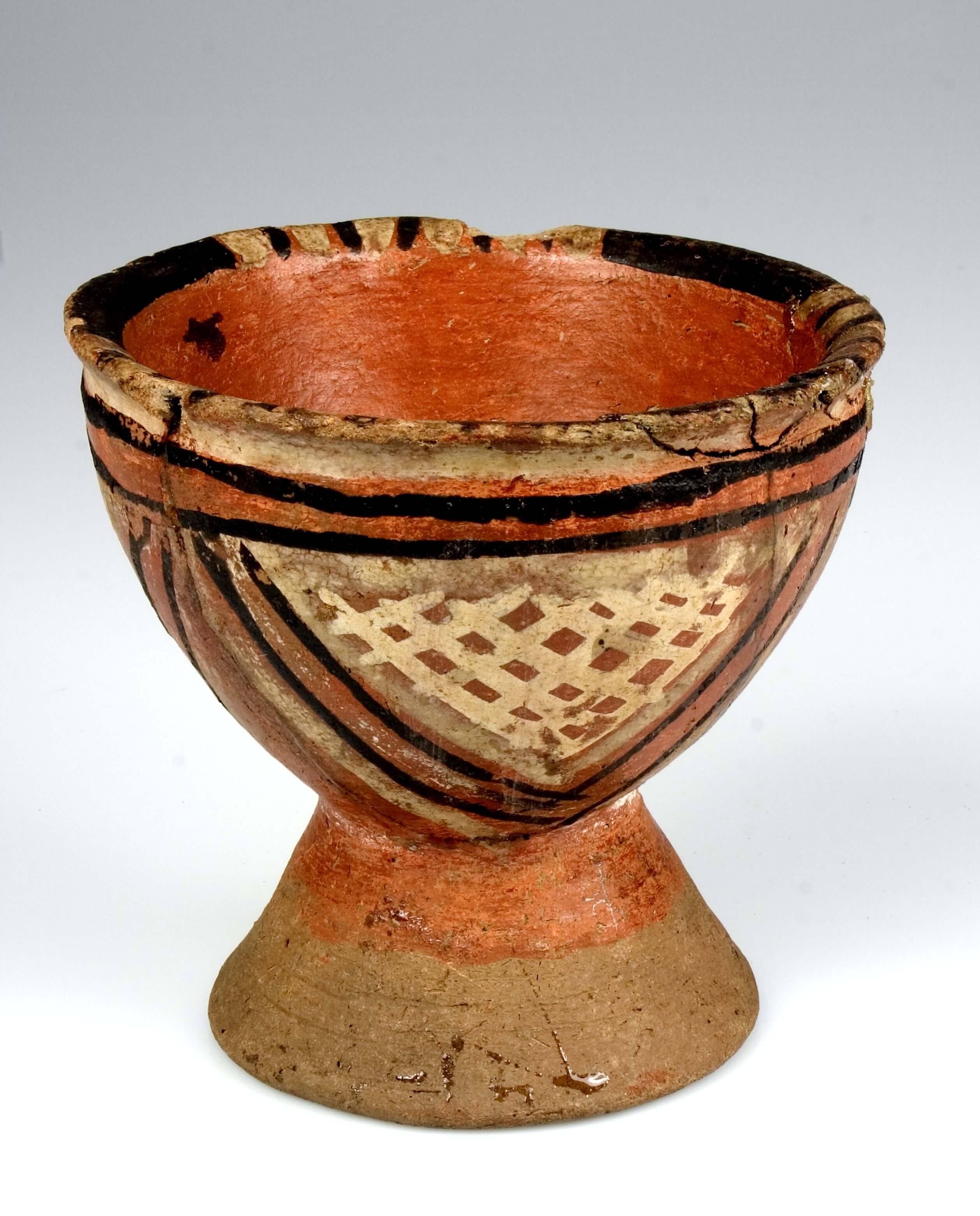 | Description | Alte Karteikarte: "Räuchergefäß, buntbemalte Tonware (der mit Löchern versehene Deckel fehlt)." Bei Hecht (1968, S. 84) wird eine Auskunft von René Gardi wiedergegeben, nach der solche Räuchergefäße mit Deckel unter die Kleidung gestellt wurden. Das Gefäß ist rot, schwarz und weiß bemalt. Eine Bruchstelle wurde geklebt. |