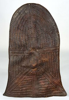 | Description | Anmerkung auf der alten Karteikarte: „Schilde aus roher Haut (Büffel oder Rind). Deutsch Bornu (von Mohamedanern wie Heiden benutzt), weitverbreitet. Mandaragebirge, von Lam-Heiden erbeutet. Mit zahlreichen Buckeln, welche Muster darstellen, verziert, ganz ähnlich "Fullaschild von Barndaki" Passarge S. 70, Abb. 42 [...] b, 87 lang mit Handhabe aus Leder [...].“ Als ethnische Zuordnung ist auf der kolonialzeitlichen Karteikarte "Lam-Heiden" angegeben. Lam heißt heute ein Ort im Departement Mayo-Louti in der Region Nord. Er liegt neben Guider und wird überwiegend von den Guidar bewohnt. Demnach kann das Objekt auf die Guidar zurückgehen (Tevodai Mambai und Isabella Bozsa, 8.09.2021). |
