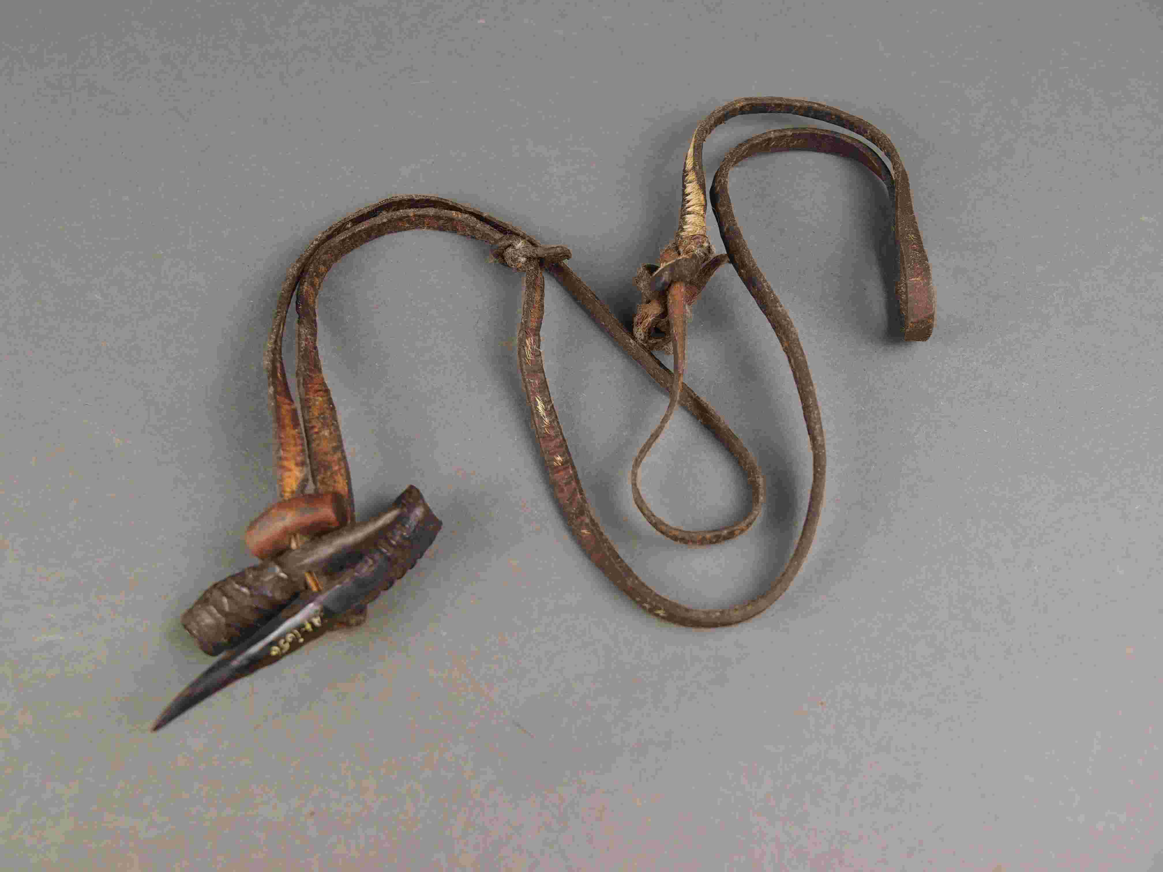 | Description | 2 Gehörnspitzen, 1 Holzstück, auf Lederriemen aufgezogen |