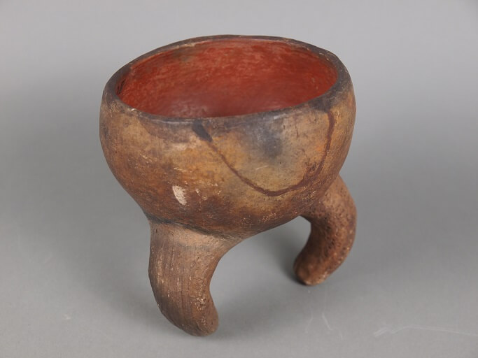 | Description | Tongefäß auf 3 nach innen gebogenen Füßen, die durch Rillen und Stichornamente verziert sind, außen: braun, innen: rot |