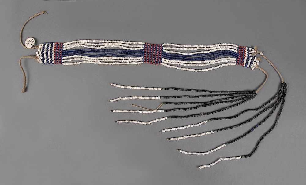 | Description | offene Enden, an einem Ende:2 Bündel mit je 4 schwarz-weißen Perlenschnüre auf Bindfaden aufgezogen |