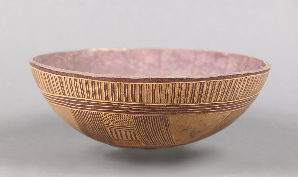 | Description | einer Kalebassenschale, eingeritzte Ornamente, violett |