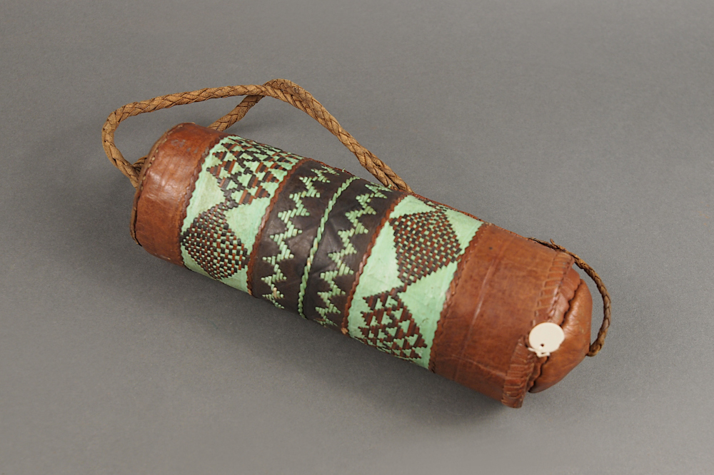 | Description | zwei ineinandersteckbare Lederzylinder mit geometrischen Ornamenten |