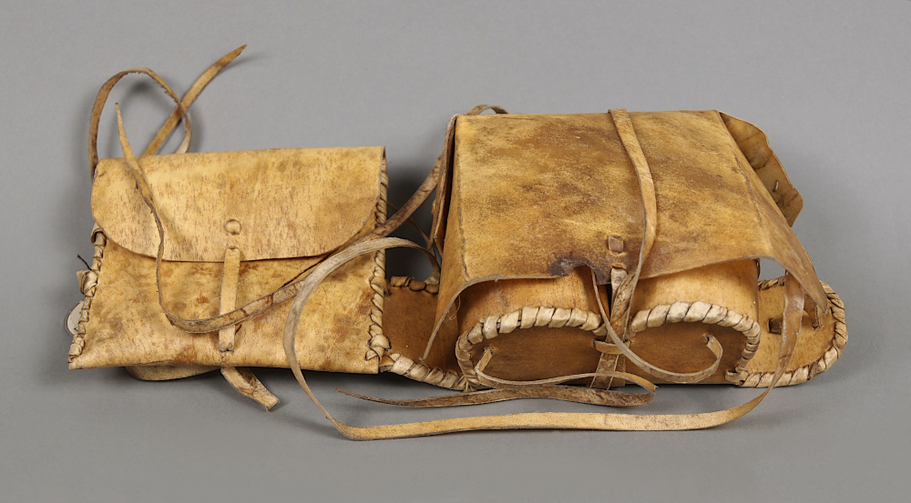 | Description | Antilopenleder, zwei Holzdosen mit Deckel, die in Lederfutteralen stecken, Schlaufe zum Befestigen am Gürtel |