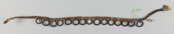 | Description | 2 pflanzliche Fasern mit Leder umwickelt, 15 Messingringe daran aufgehängt |