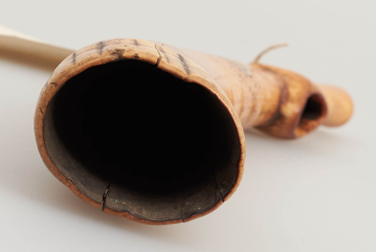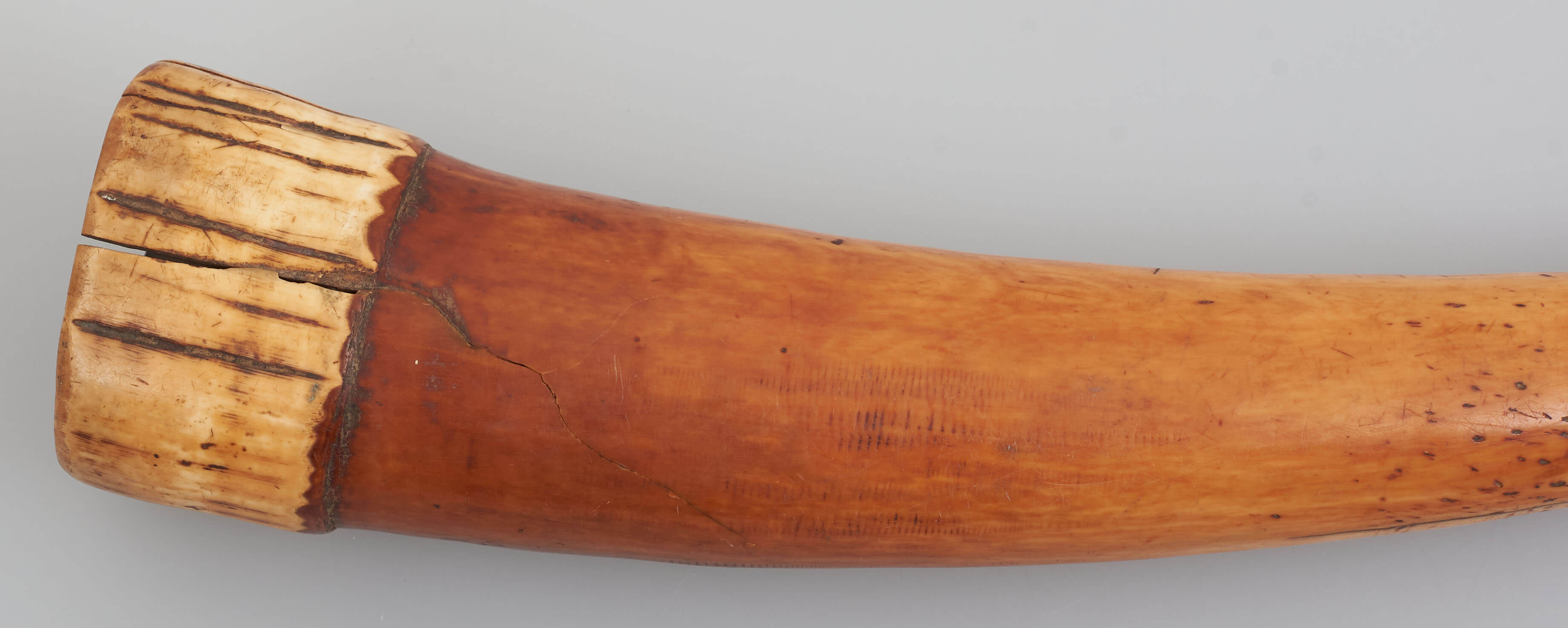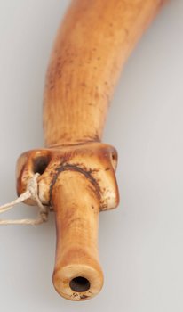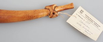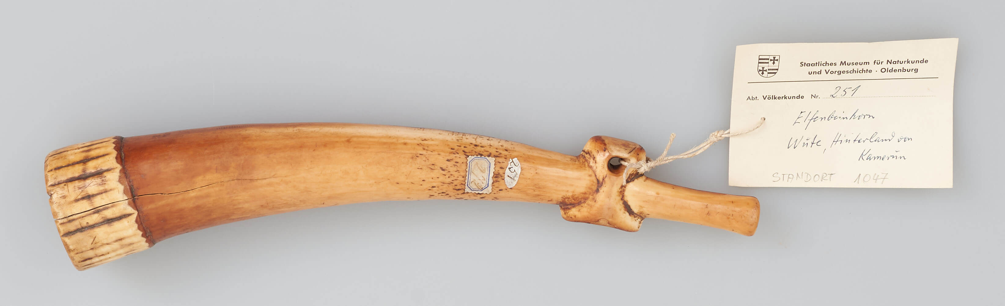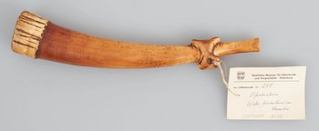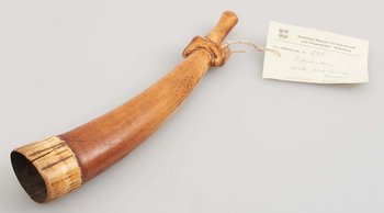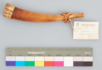| Description | Sogenannte "Kriegstrompete" aus Elfenbein. Erhalten vom Museum für Völkerkunde Berlin, aus der "Sammlung von Prltnt. Morgen (Hinterland von Kamerun)". Im entsprechenden Verzeichnis wird das Objekt als "Kriegstrompete aus Elfenbein", mit Herkunft "Wute" bezeichnet. |