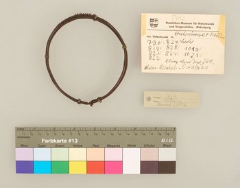 | Description | Halsring, bestehend aus drei umwickelten Eisendrähten, verziert. Im entsprechenden Langheld-Verzeichnis als "Wagogoarbeit" aus "Burungi u. Mhondo" bezeichnet. |