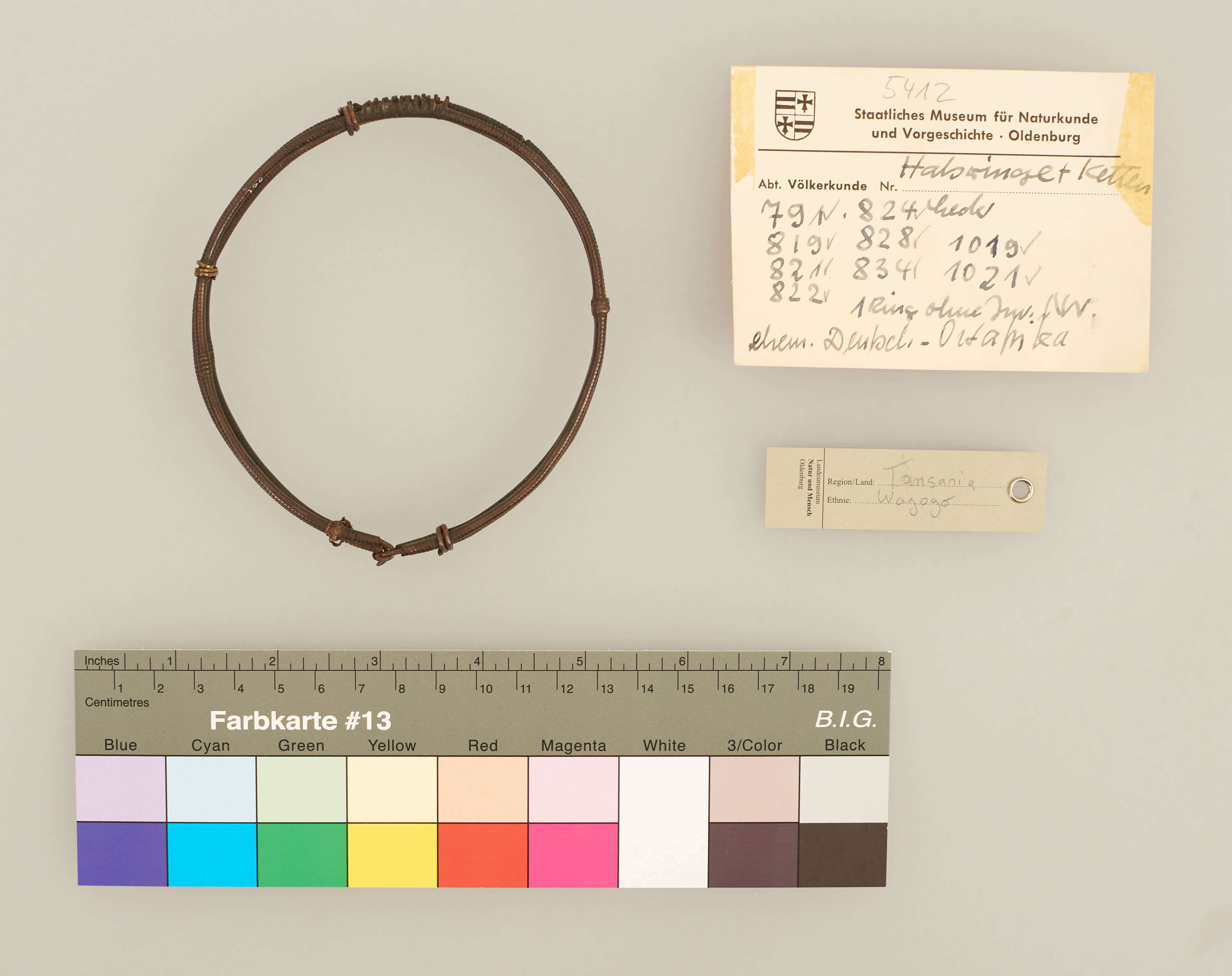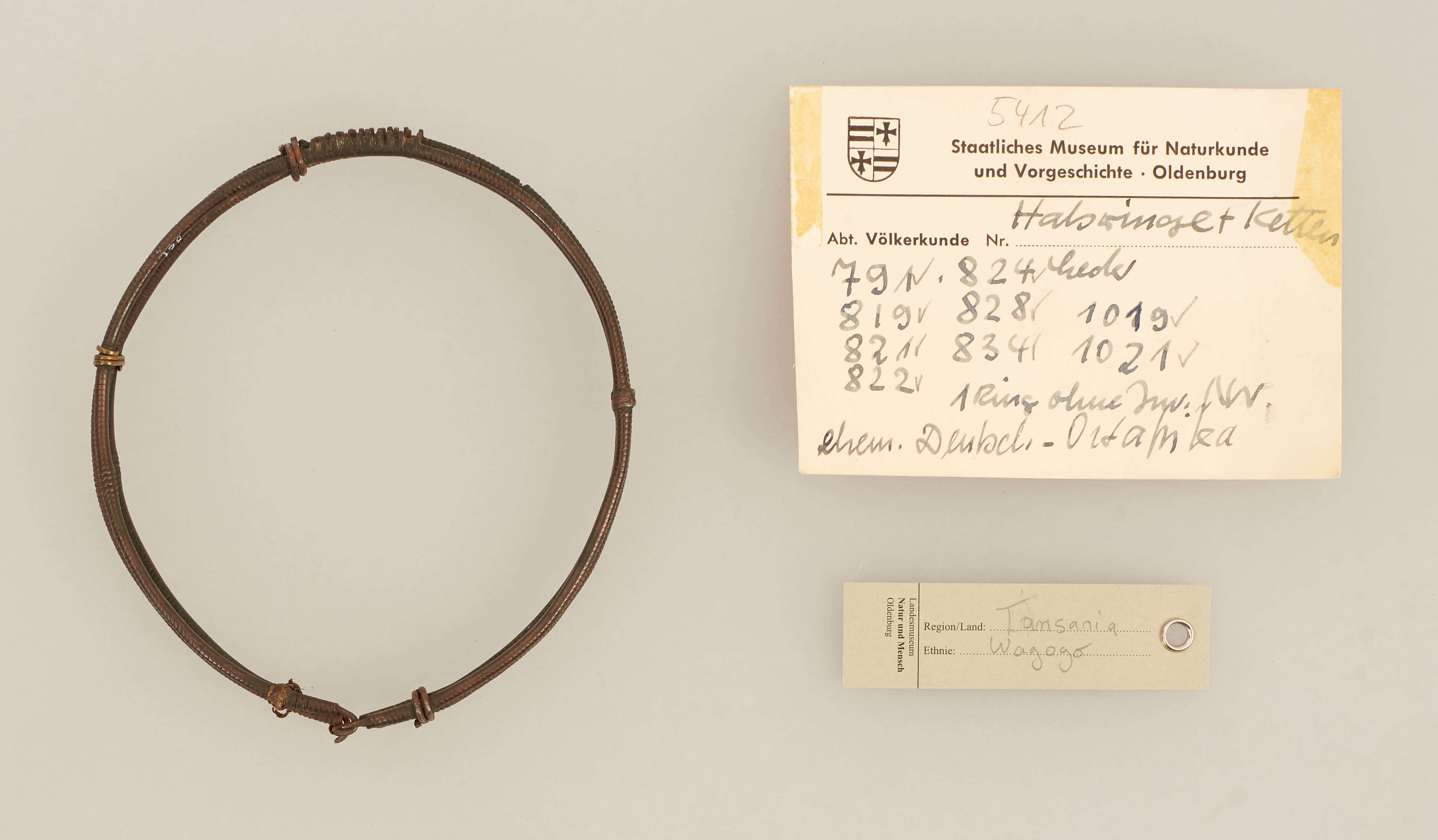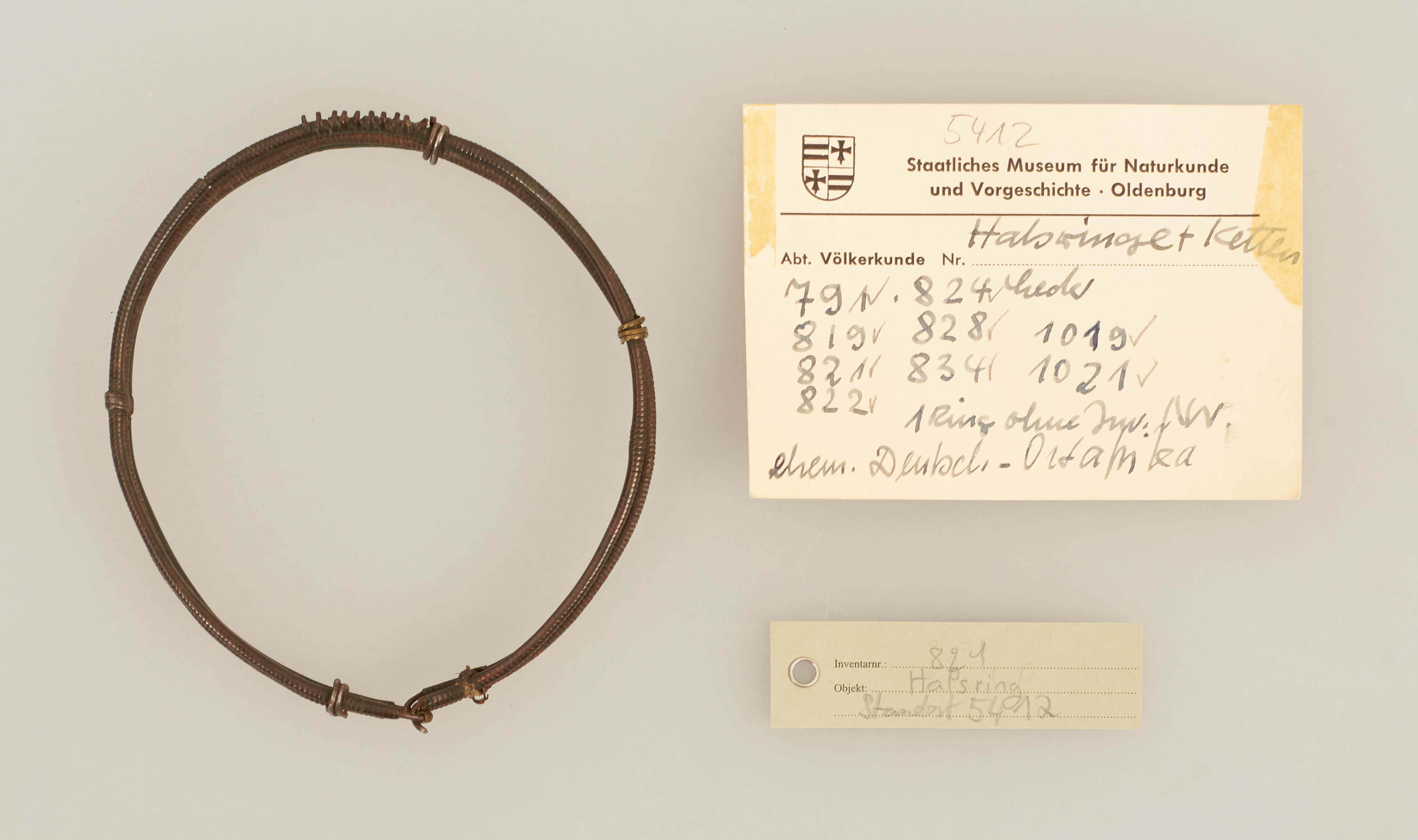 | Description | Halsring, bestehend aus drei umwickelten Eisendrähten, verziert. Im entsprechenden Langheld-Verzeichnis als "Wagogoarbeit" aus "Burungi u. Mhondo" bezeichnet. |