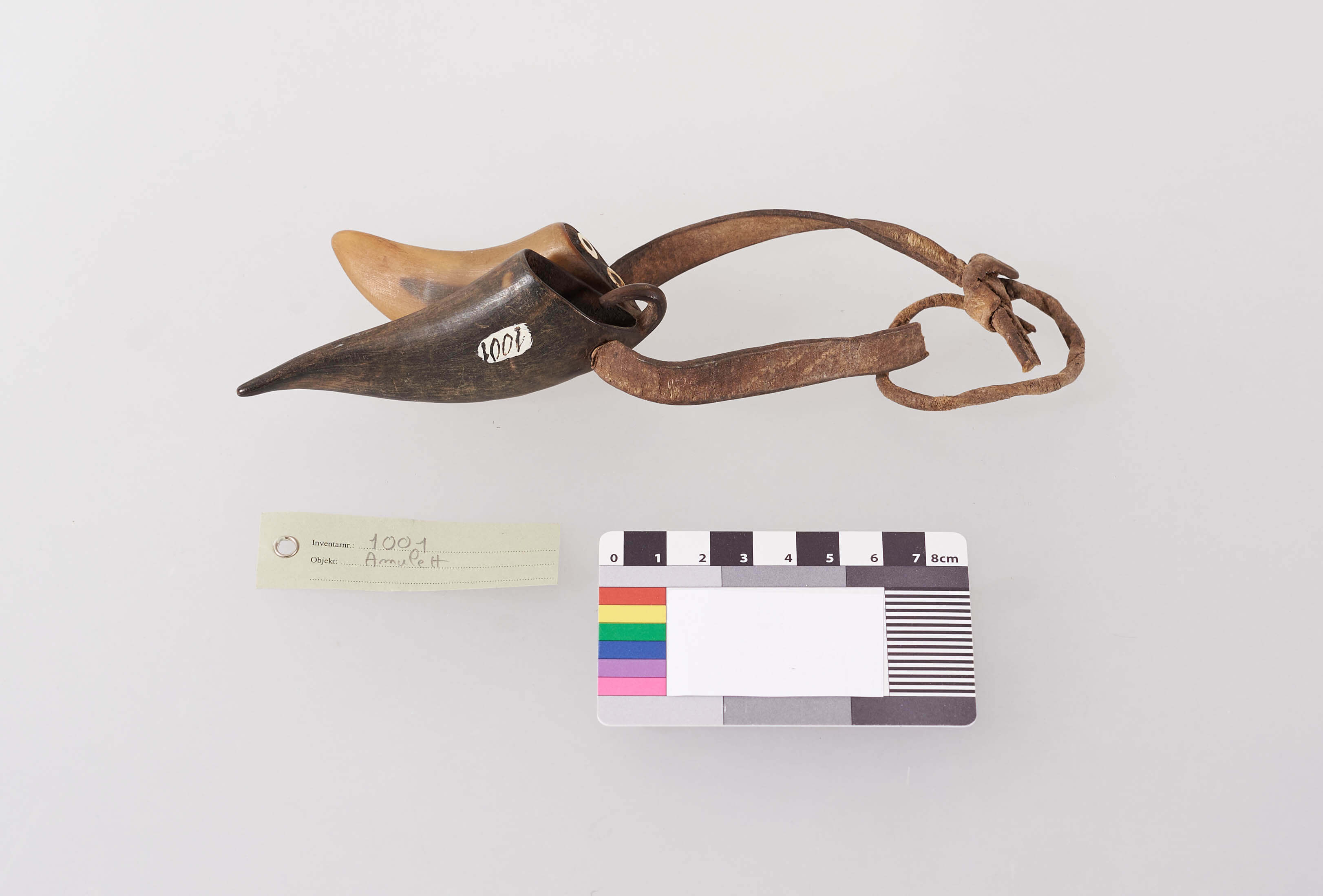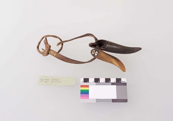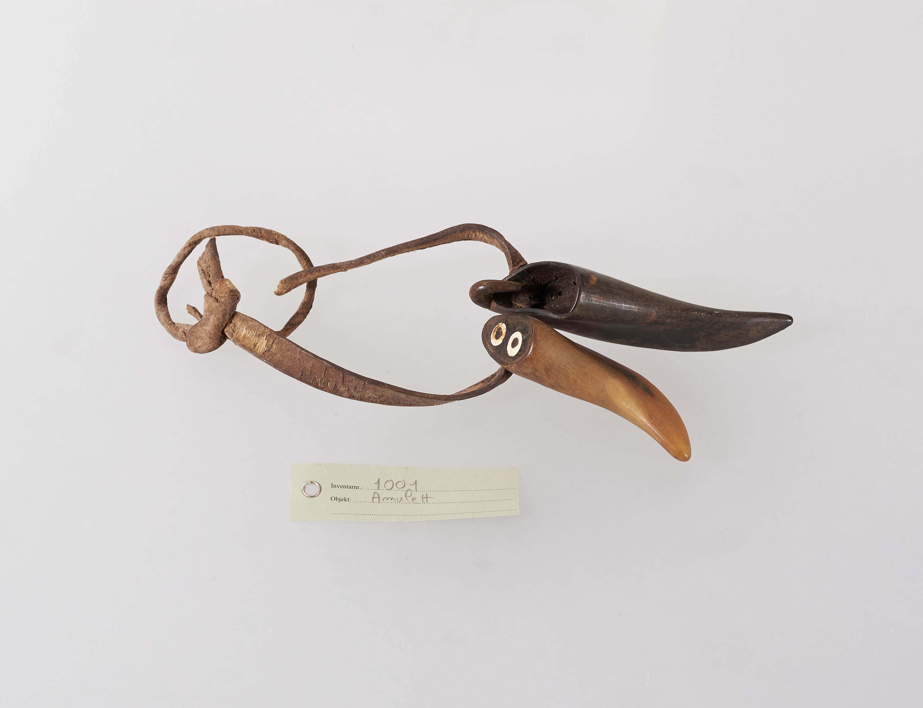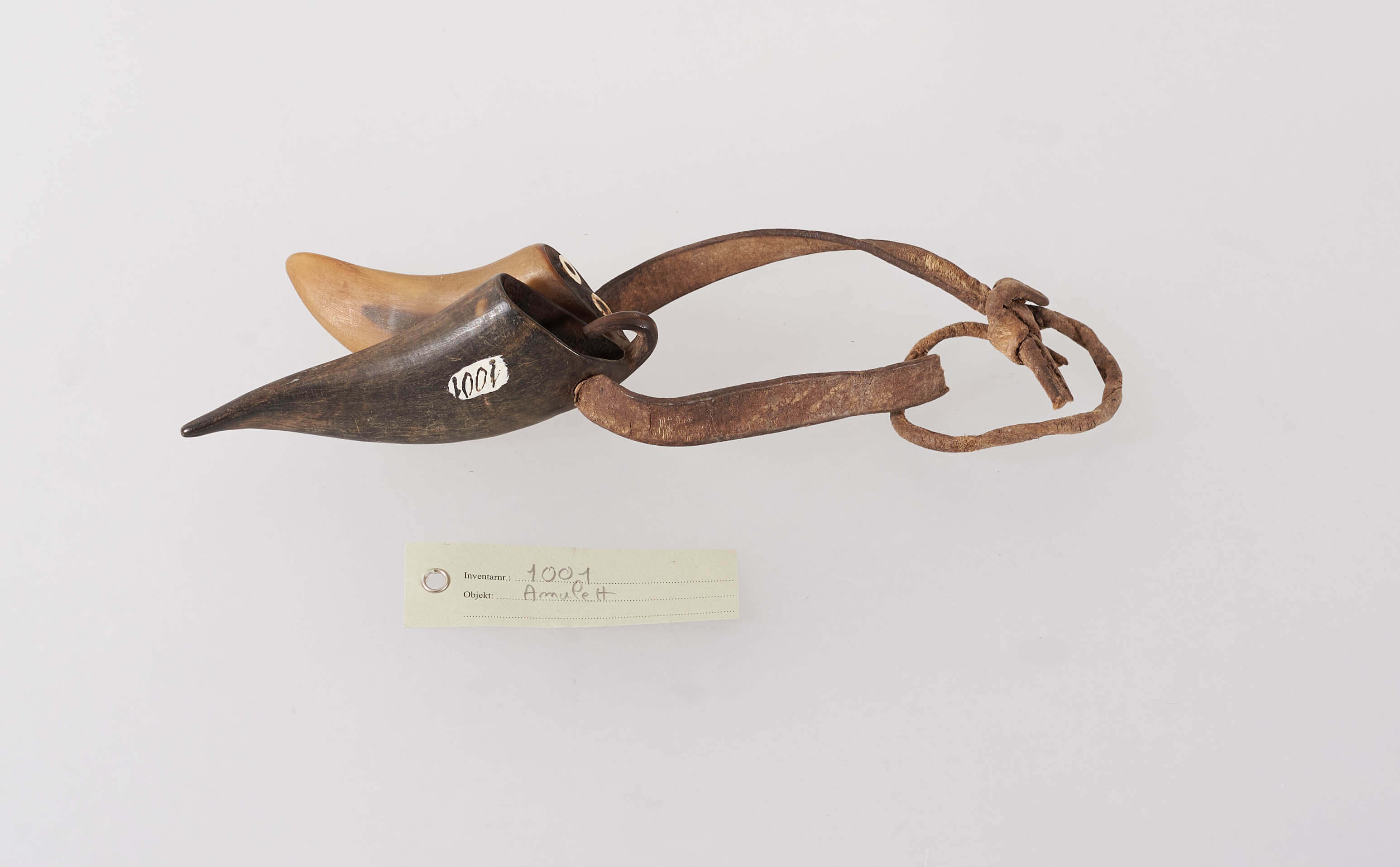 | Description | Amulett bestehend aus zwei Hörnern an einem Lederriemen. In einem Horn befinden sich zwei kleine eingesetzte Ringe aus Elfenbein. |