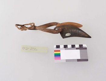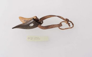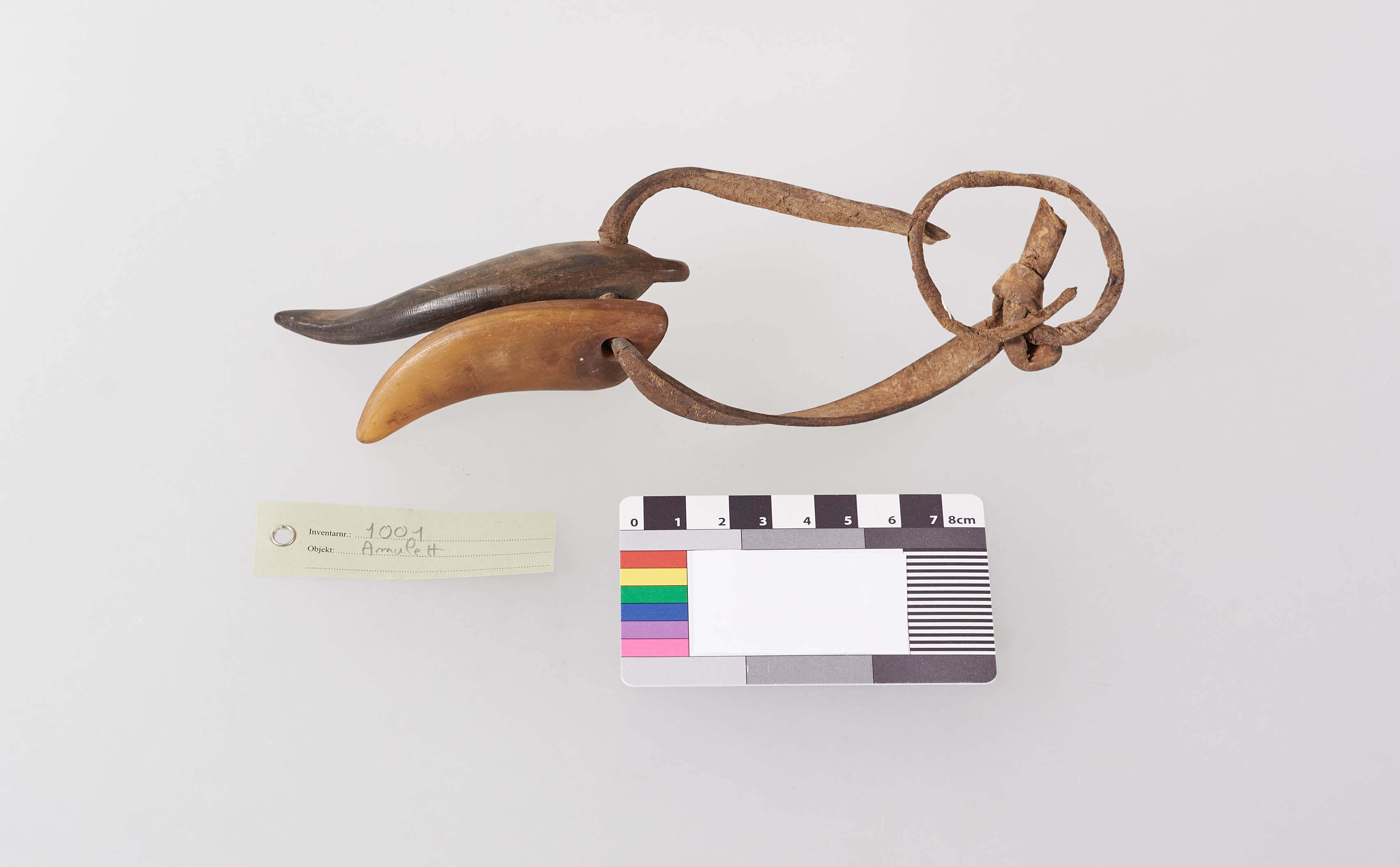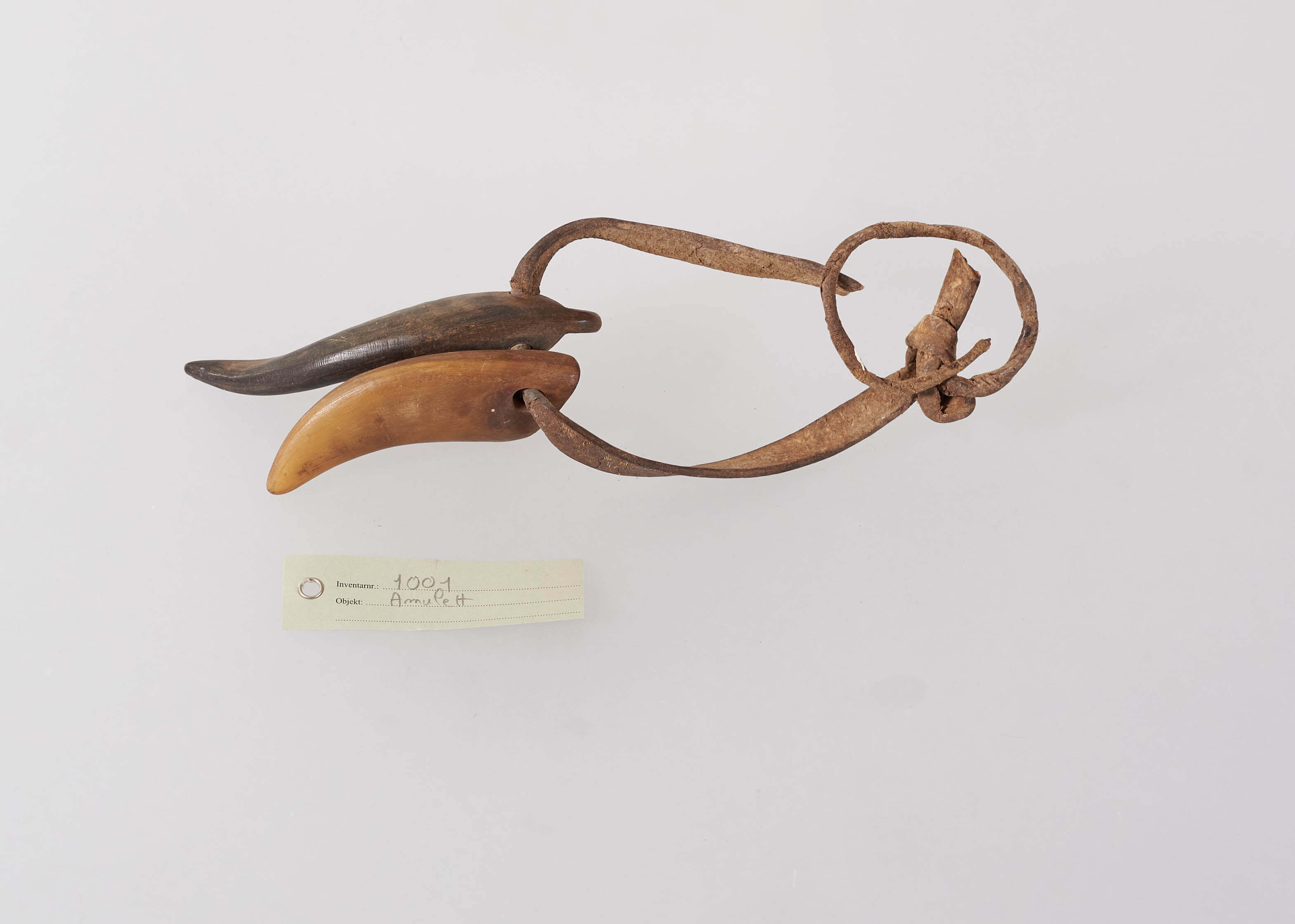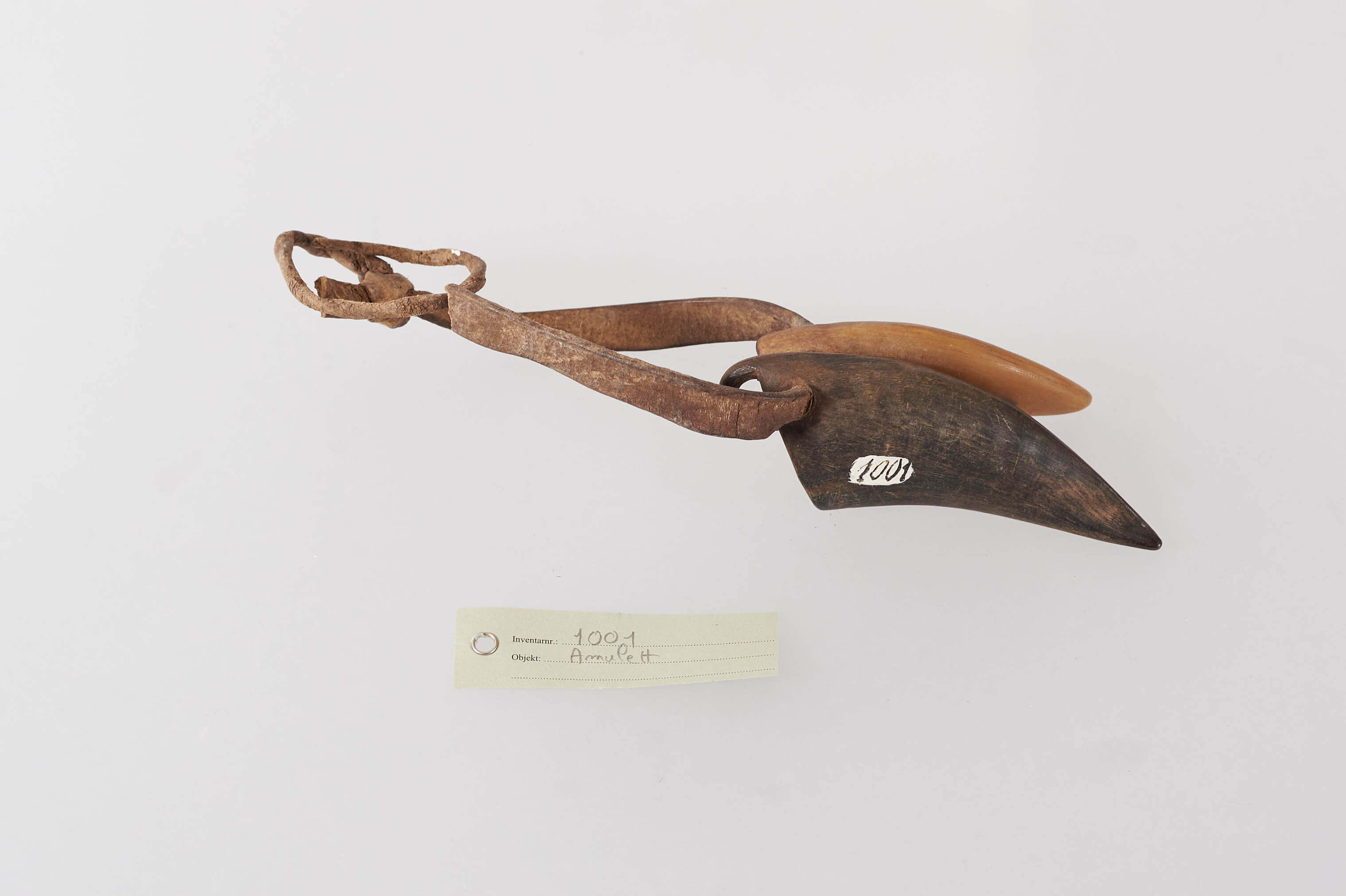 | Description | Amulett bestehend aus zwei Hörnern an einem Lederriemen. In einem Horn befinden sich zwei kleine eingesetzte Ringe aus Elfenbein. |