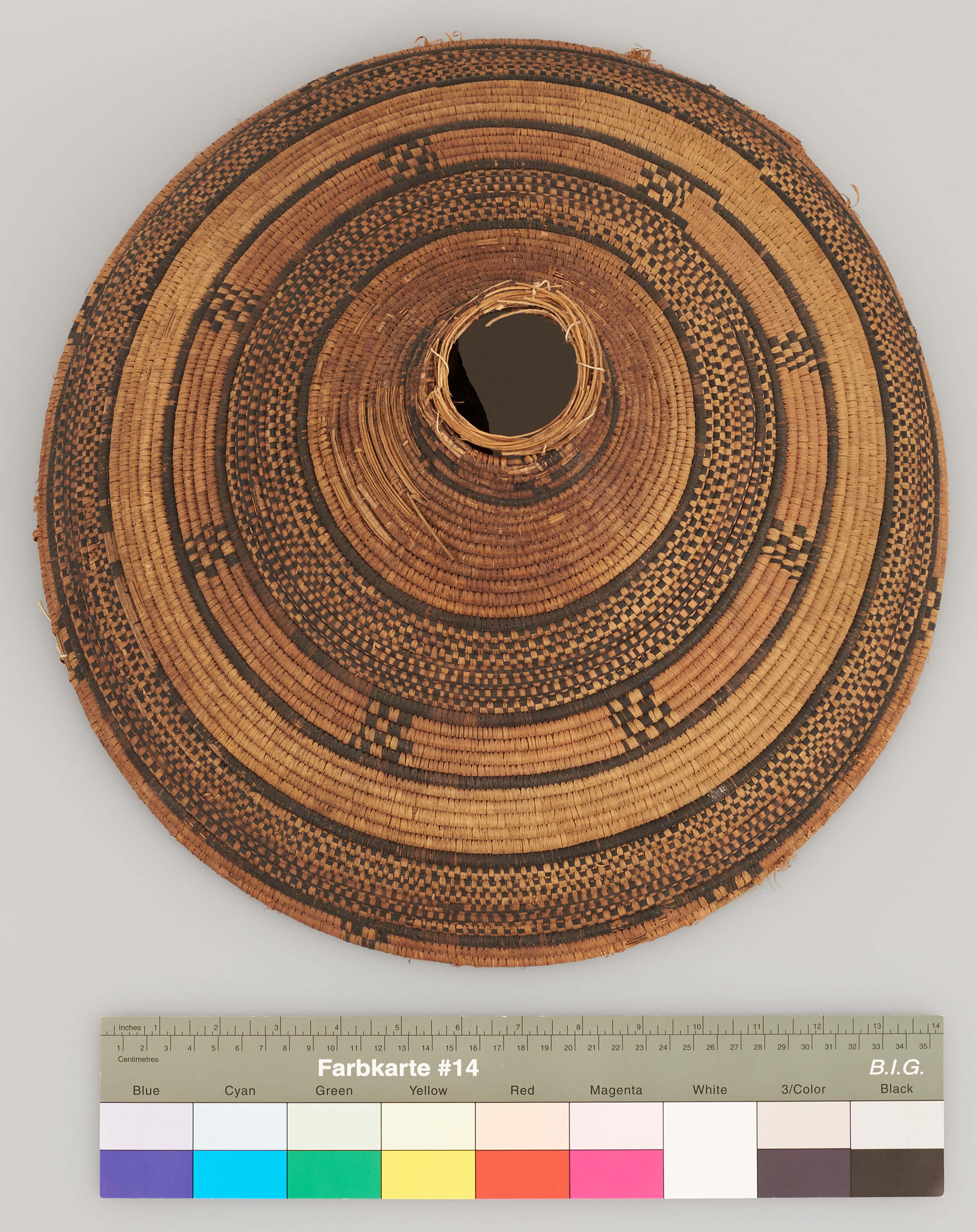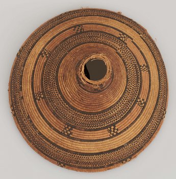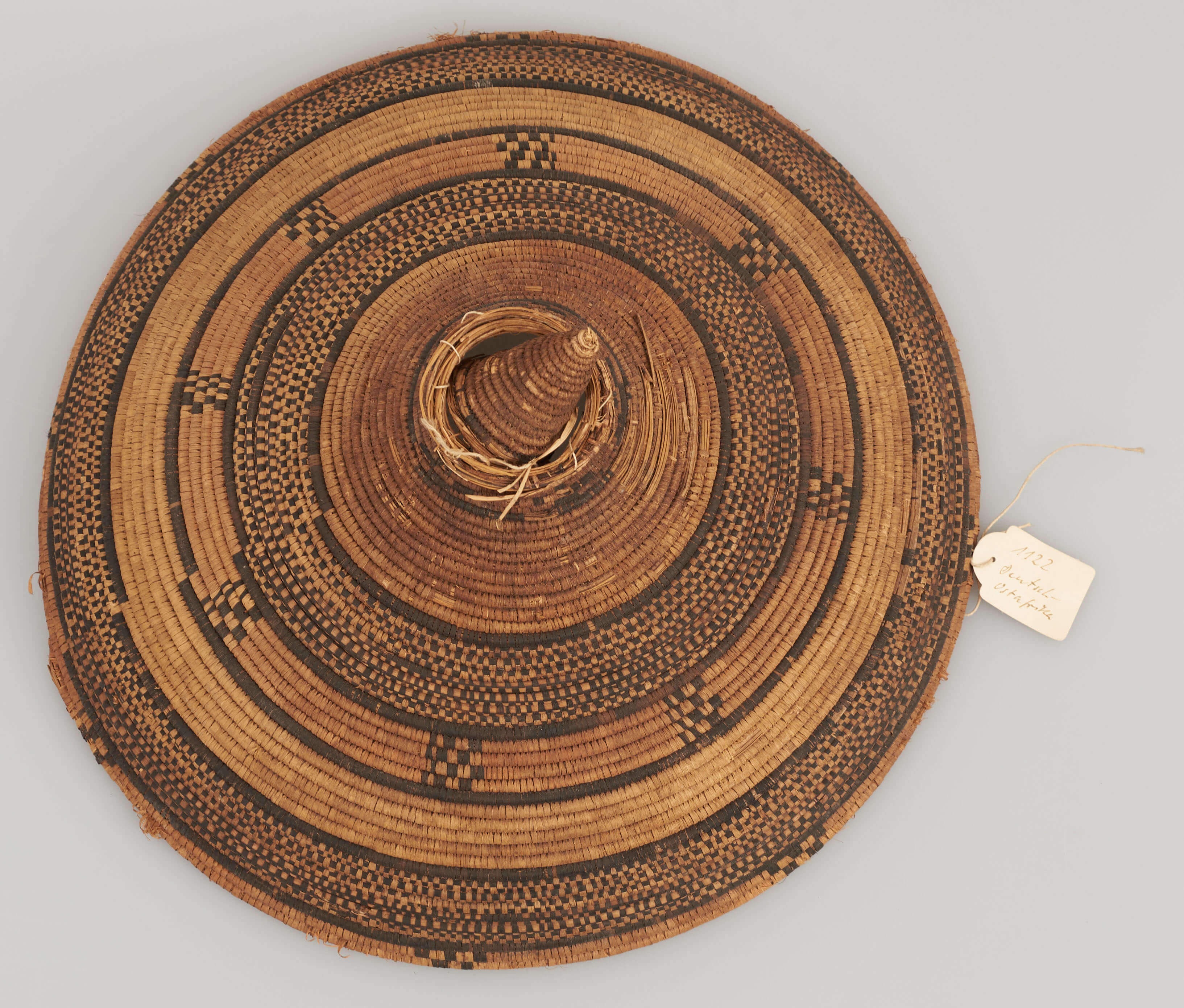 | Description | Geflochtener Deckel, schwarz-rot-gold gemustert, die Spitze ist abgebrochen. |