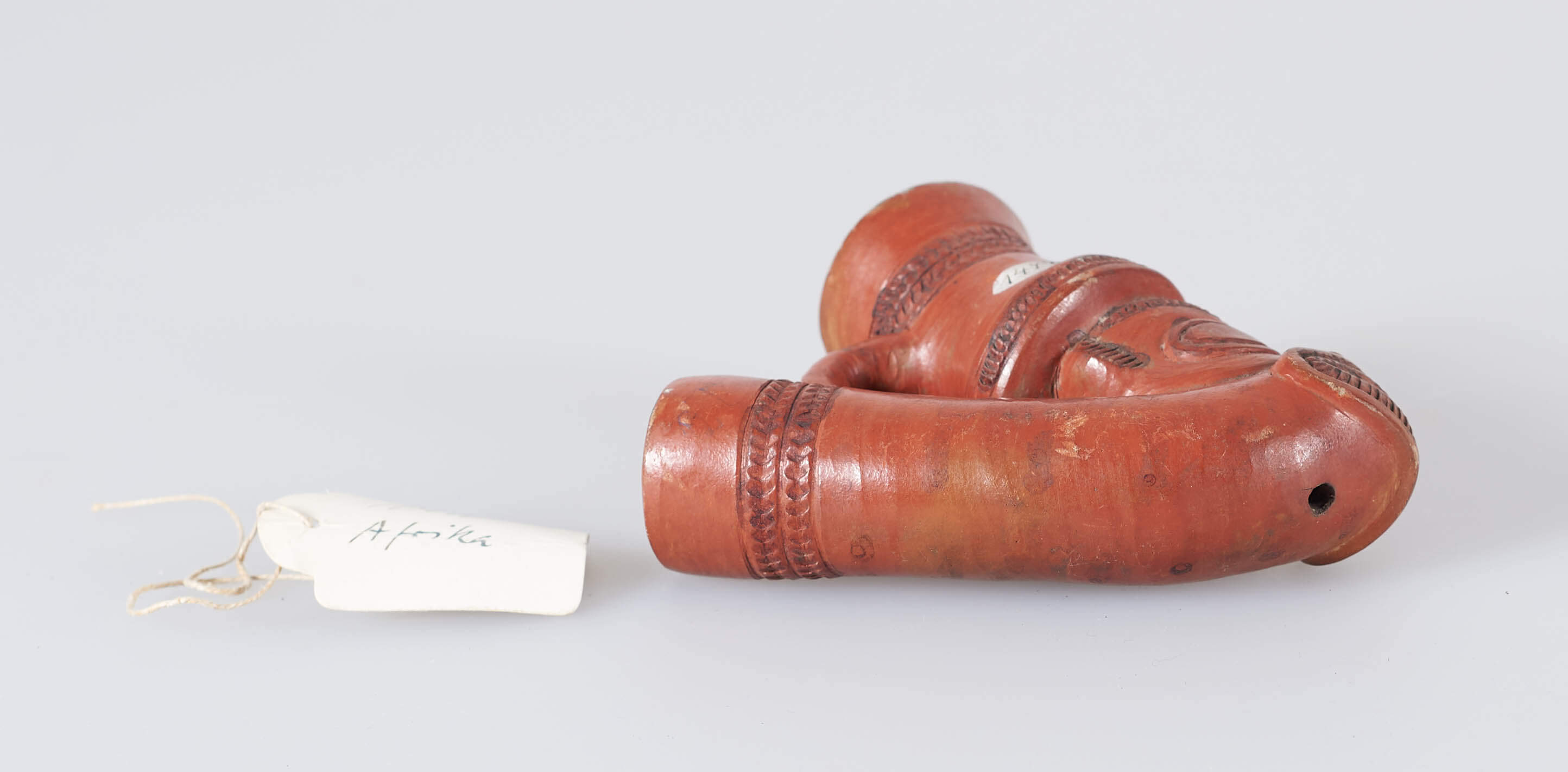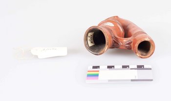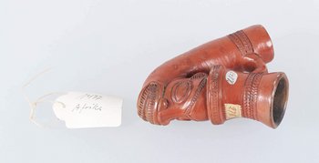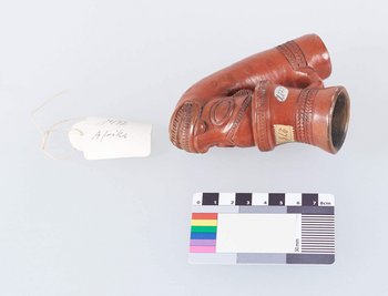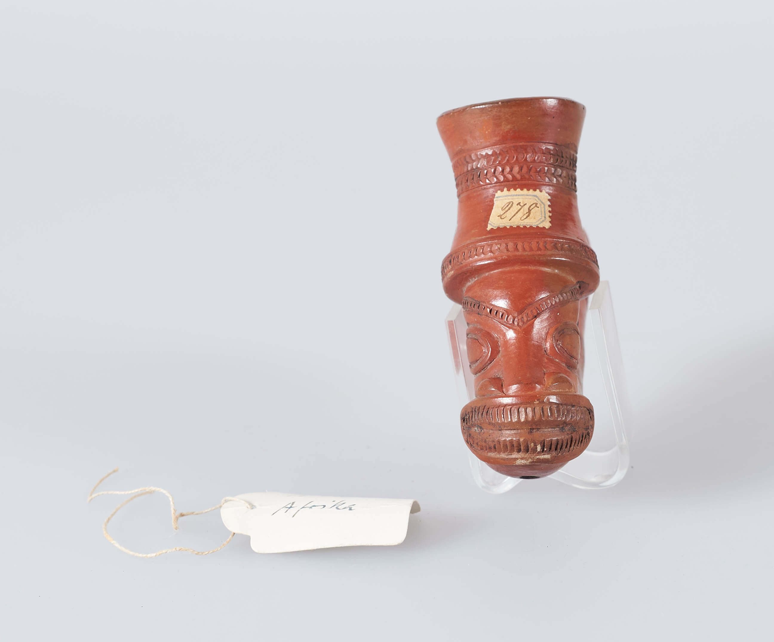 | Description | Pfeifenkopf aus rotem Ton, mit Ritzverzierungen und schwarzen Bemalungen. Darstellung eines Gesichts. Erhalten vom Museum für Völkerkunde Berlin, aus der "Sendung aus dem Schutzgebiete von Kamerun (Dr. Zintgraff)". |