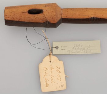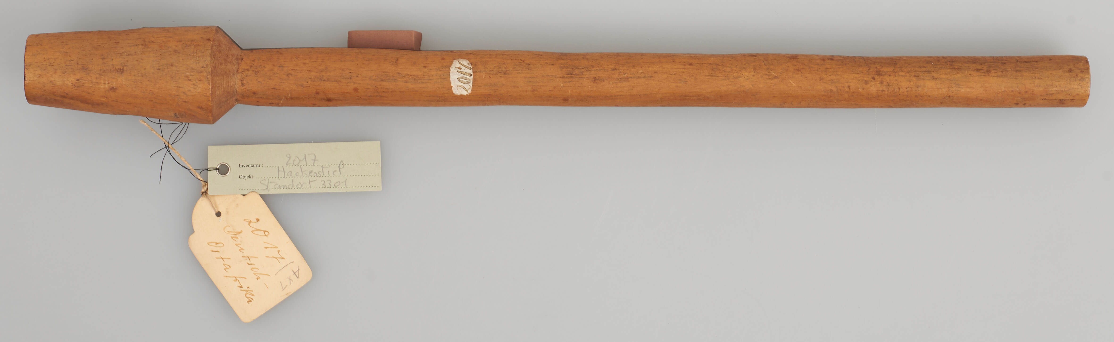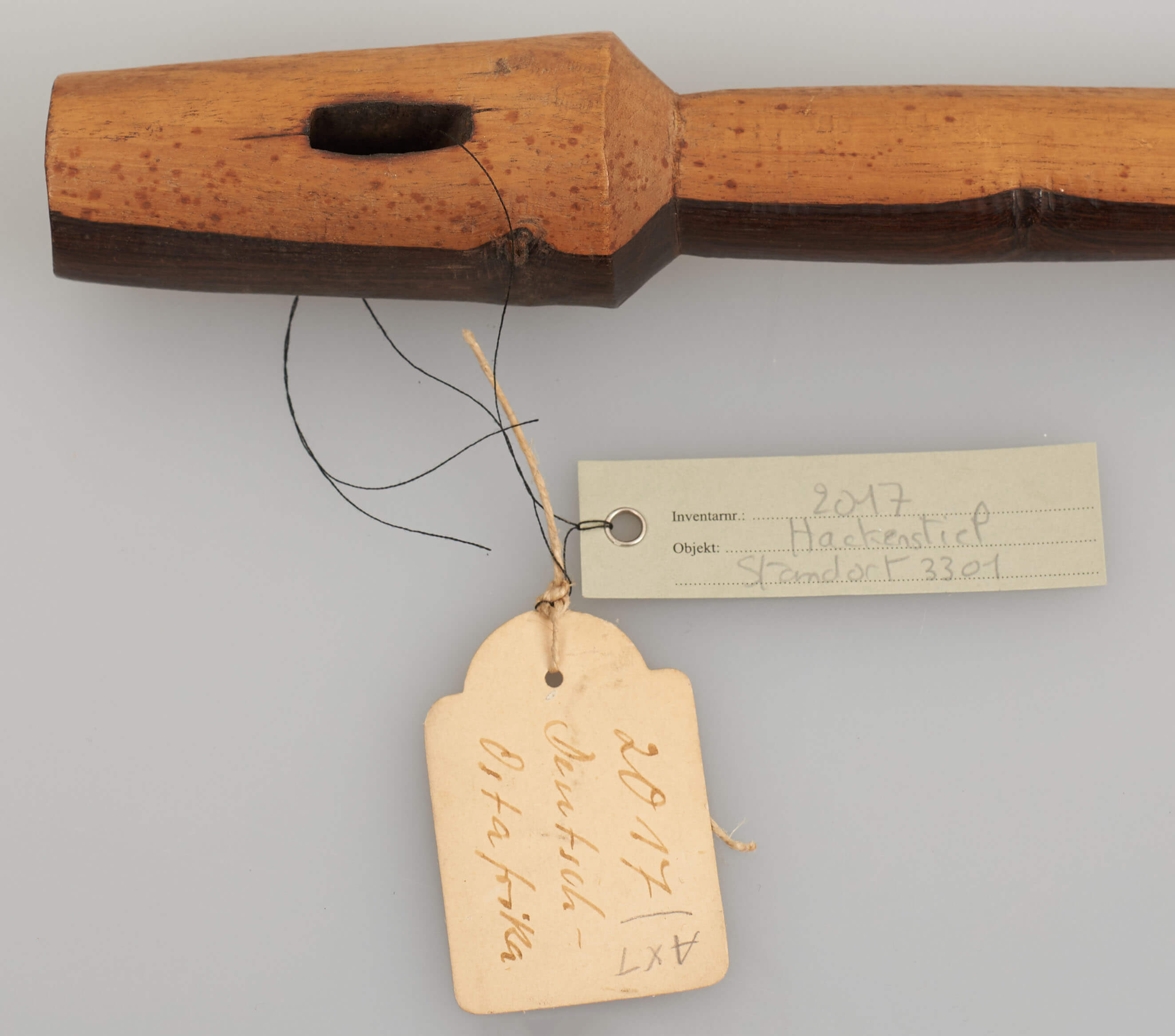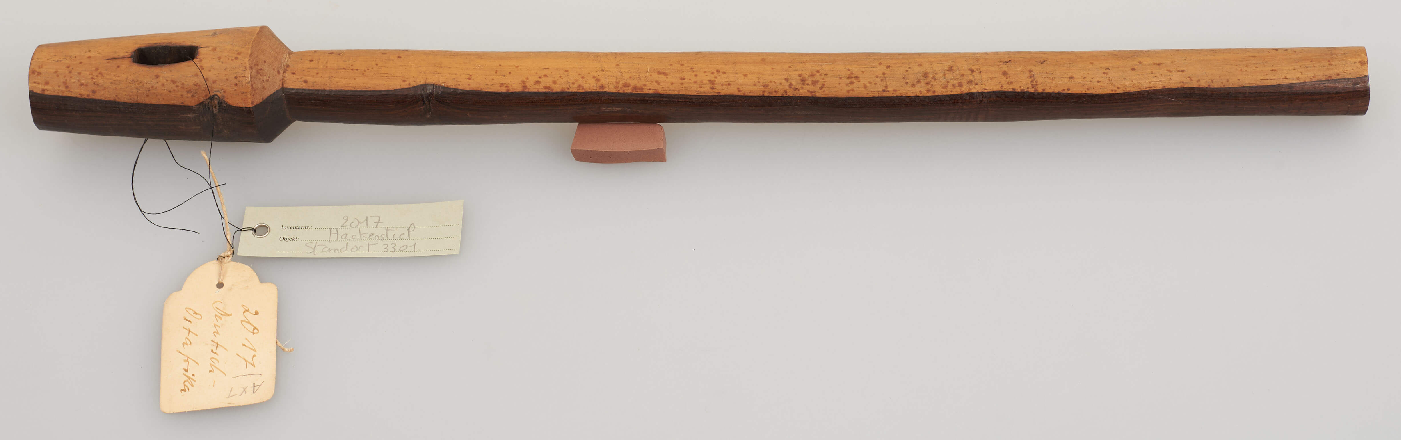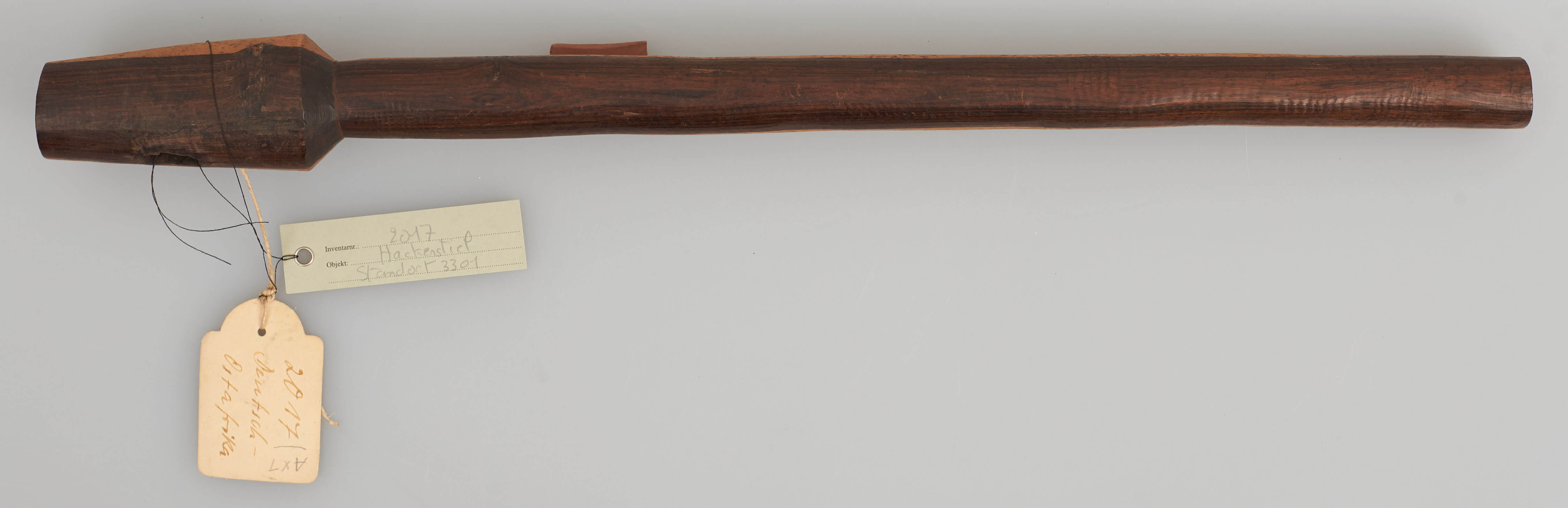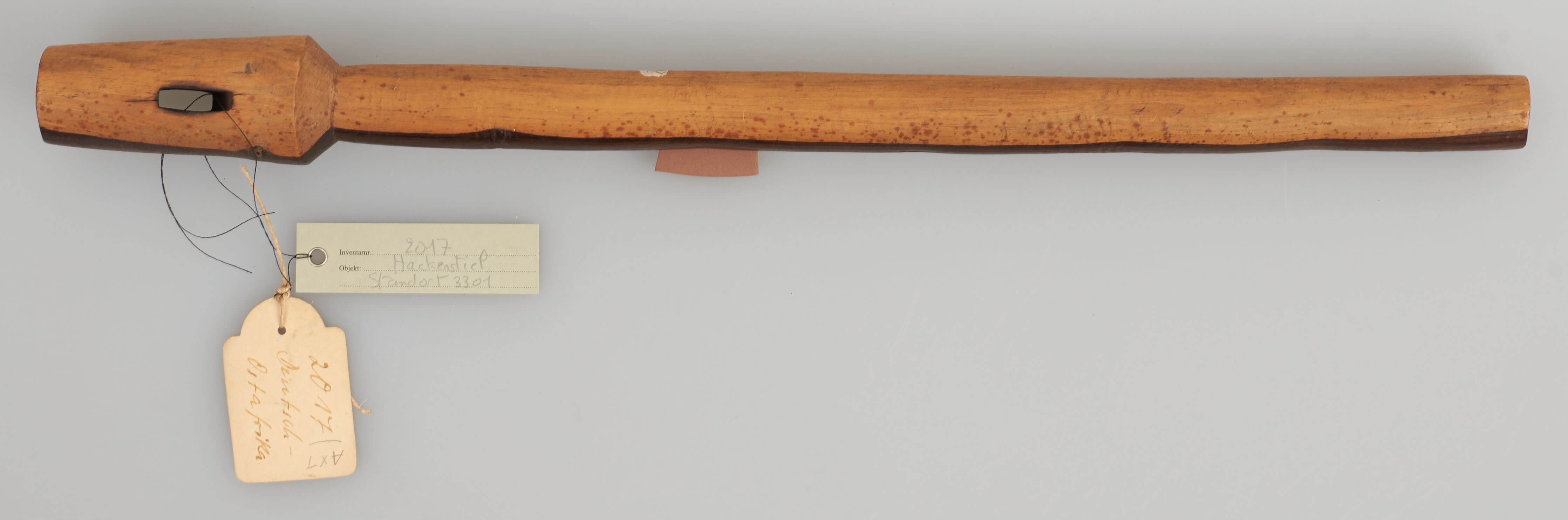 | Description | Zweifarbiger Stiel aus Holz, ohne Klinge. Laut Inventarbuch des Landesmuseum Natur und Mensch Oldenburg "Hacke (Axt) aus Uremba". |