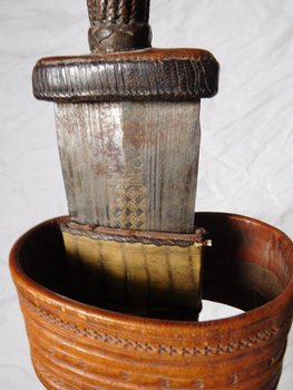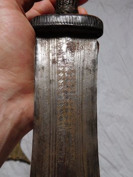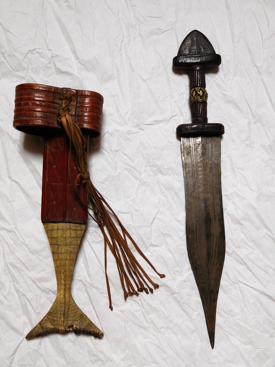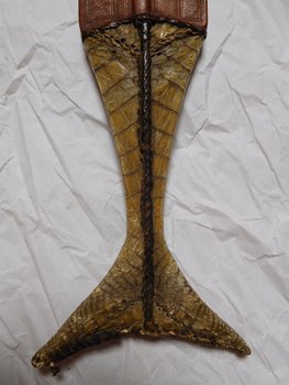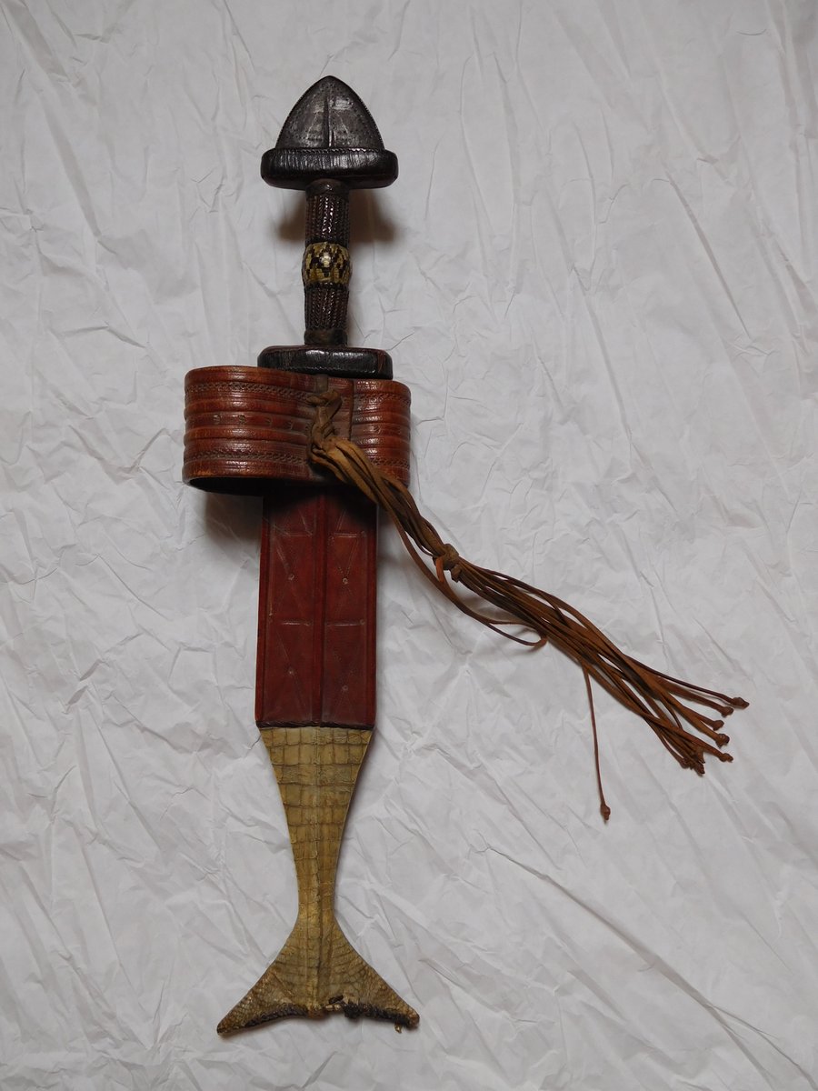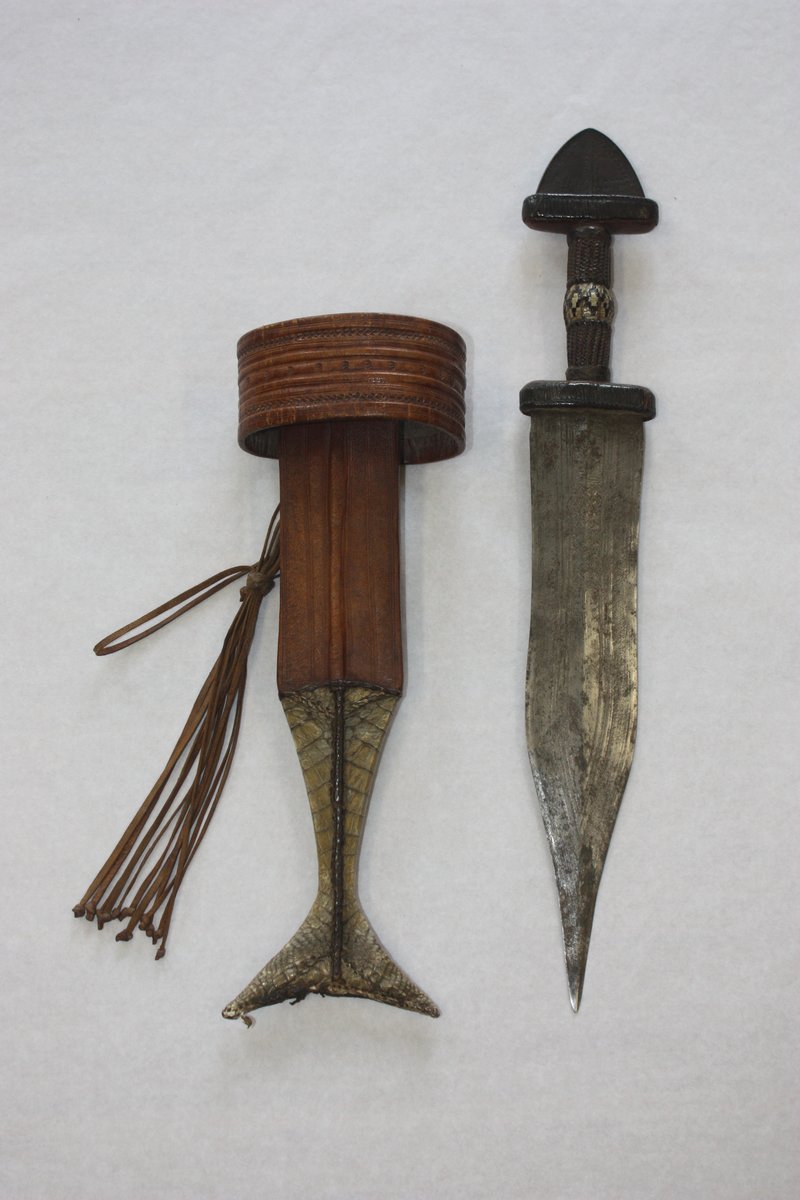 | Description | Dolch mit Griff und Scheide, das Ende der Scheide ist in Form eines Fischschwanzes. An der Scheide befindet sich eine Schlaufe zum Tragen des Dolchs am Arm. Die Scheide ist mit Lederfransen verziert. |
