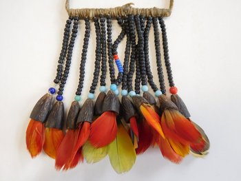 | Description | Kordel mit mehreren Perlensträngen, an deren Ende Schalen einer Nuss oder Frucht und Federn hängen. |