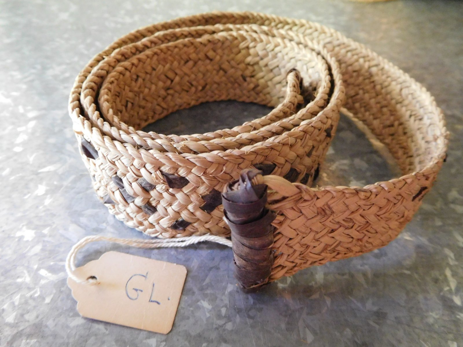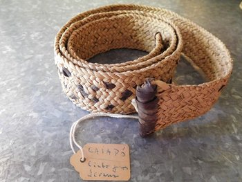 | Description | Gürtel mit braunem Lederband durchzogen. Eine Seite läuft spitz zu und ist in Leder eingefasst, die andere Seite ist gerade in Leder eingefasst. |