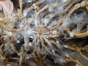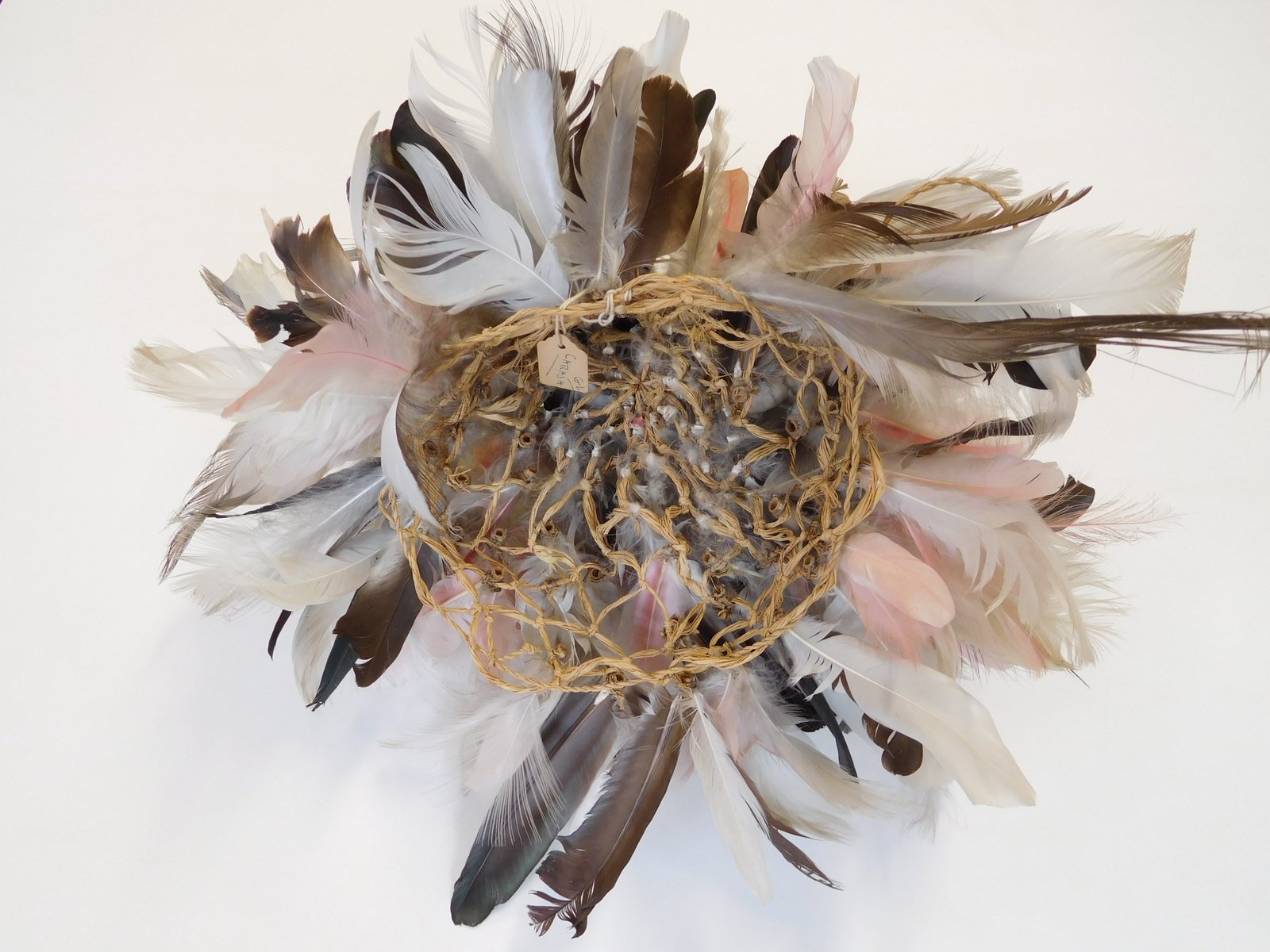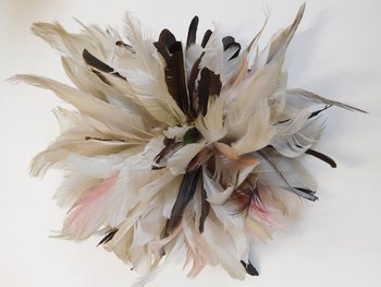 | Description | Ein Korbnetz bildet das Gerüst, an das zahlreiche rosa, schwarze und weiße Federn gebunden sind. Eine schwarze Feder hat sich gelöst und liegt lose im Papier. |