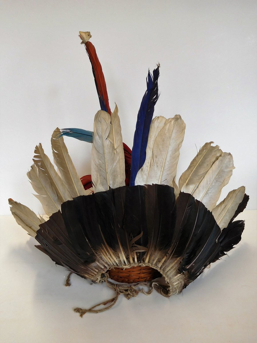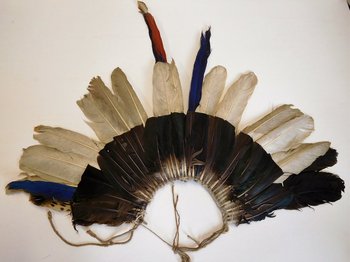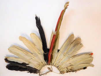 | Description | Braune, weiße und vereinzelnd rote und blaue Federn, die durch ein Band in zwei Reihen eng zusammengeknüpft sind. Die eine Reihe mit braunen Federn ist oben abgeschnitten. Drei Federn überragen die anderen deutlich. Die Kordelenden sind verlängert, vermutlich um sie um den Kopf binden zu können. |