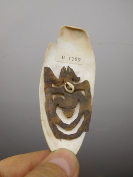 | Description | Ein Teil einer Schneckenschale, der auf der Innenseite mit einer Schnitzerei aus Schildpatt verziert ist. Das Schildpatt ist mit einer Schnur und einem Scheibchen einer Nassa Schnecke befestigt. |