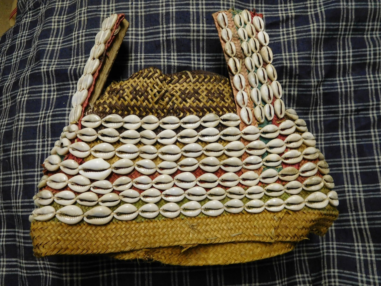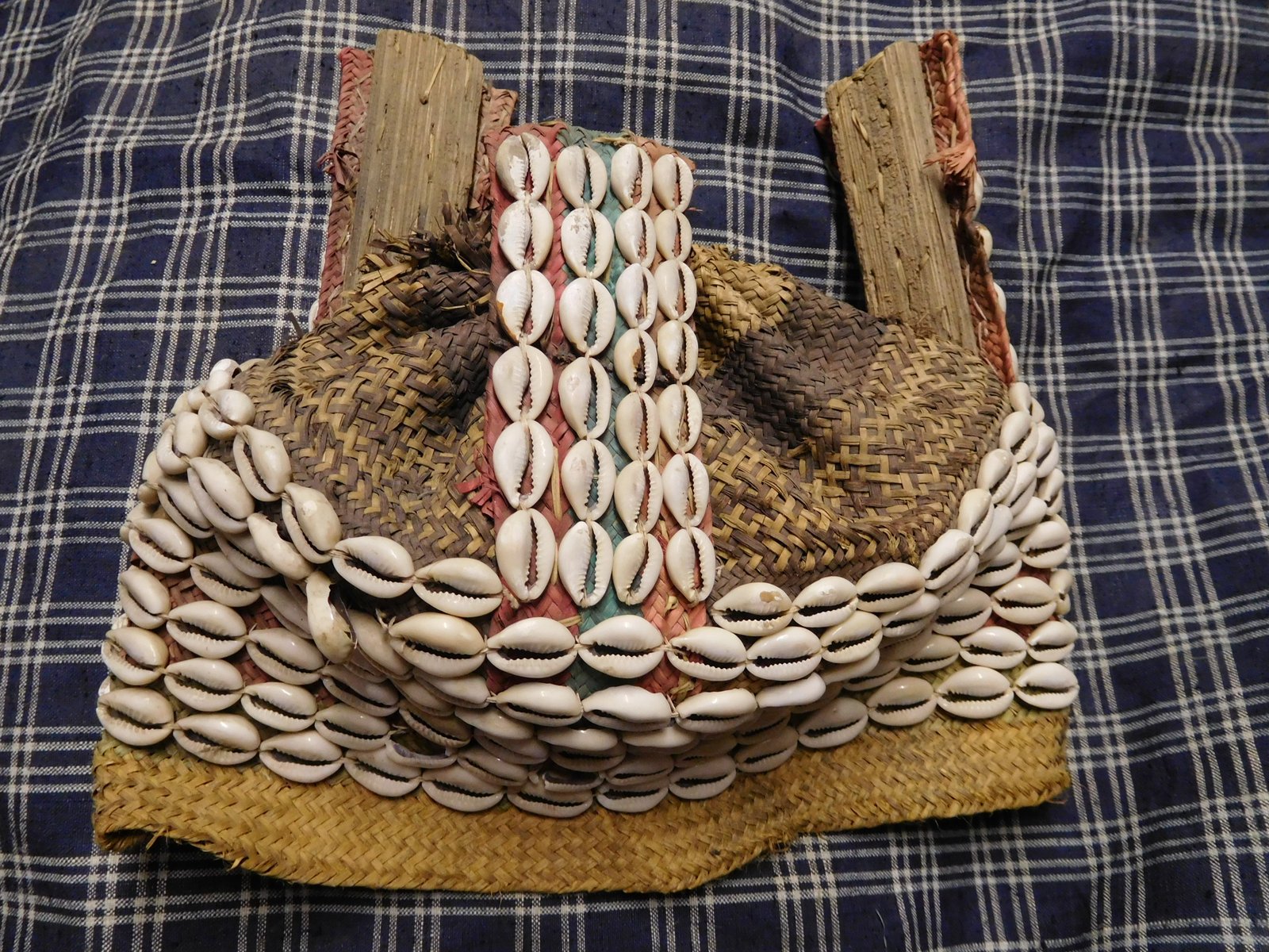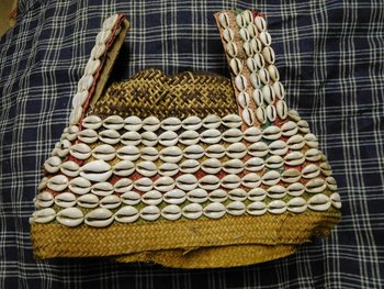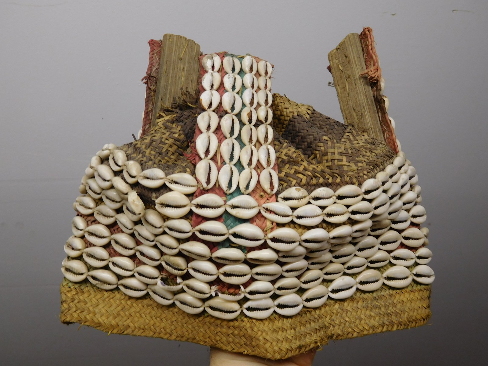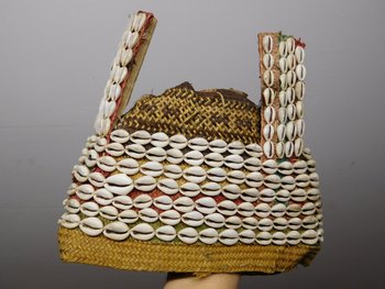 | Description | Kopfschmuck aus Korb mit drei Spitzen, teilweise rot und grün bemalt. Mit Kaurischnecken bestickt. |
