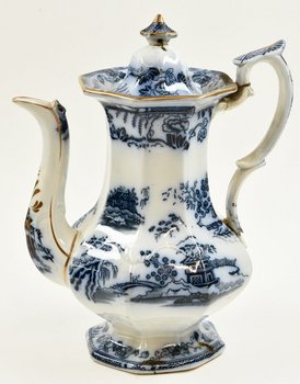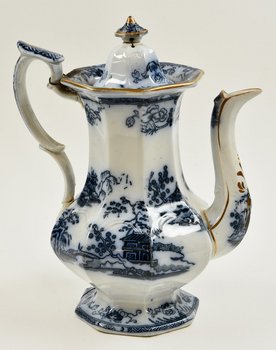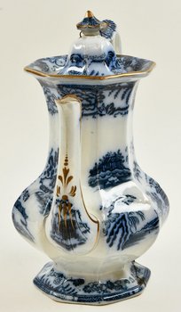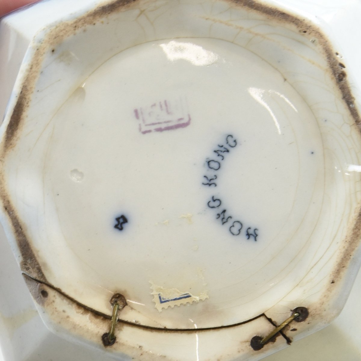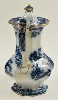 | Description | Kanne mit Deckel, weiß glasiert, schlanke bauchige, achteckige Form, weiß-blaue Malerei mit verschiedenen Landschaftsdarstellungen. Fuß, Deckel und Henkel beschädigt und repariert. Unterseitig Herstellermarke HONGKONG + Stempel + Symbol. |