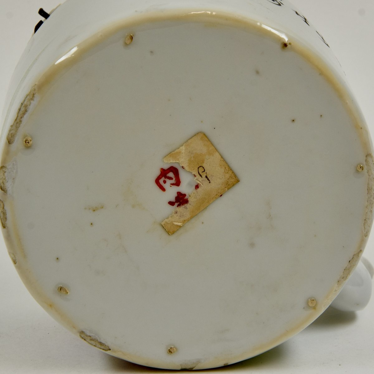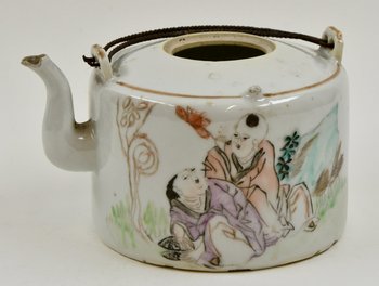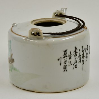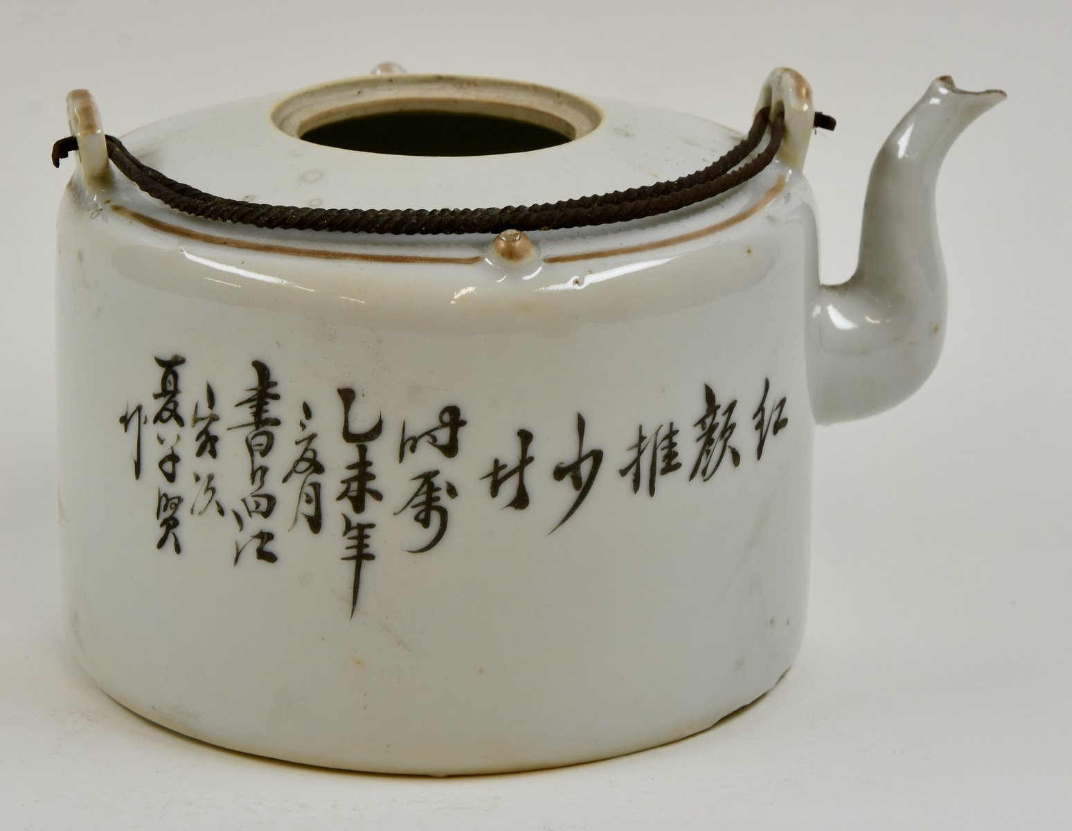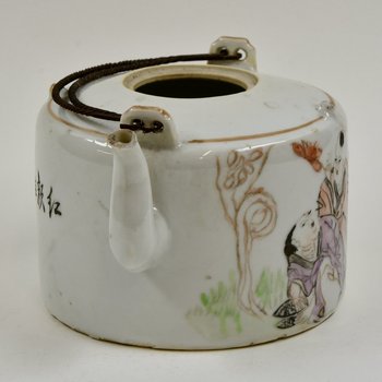 | Description | Teekanne ohne Deckel, weiß glasiert, zylindrische Form, Henkel als kräftiger Drahtbügel, chinesische Porzellanmalerei, Tülle angestoßen, unterseitig abgerissener Aufkleber und chin. Stempel. |
