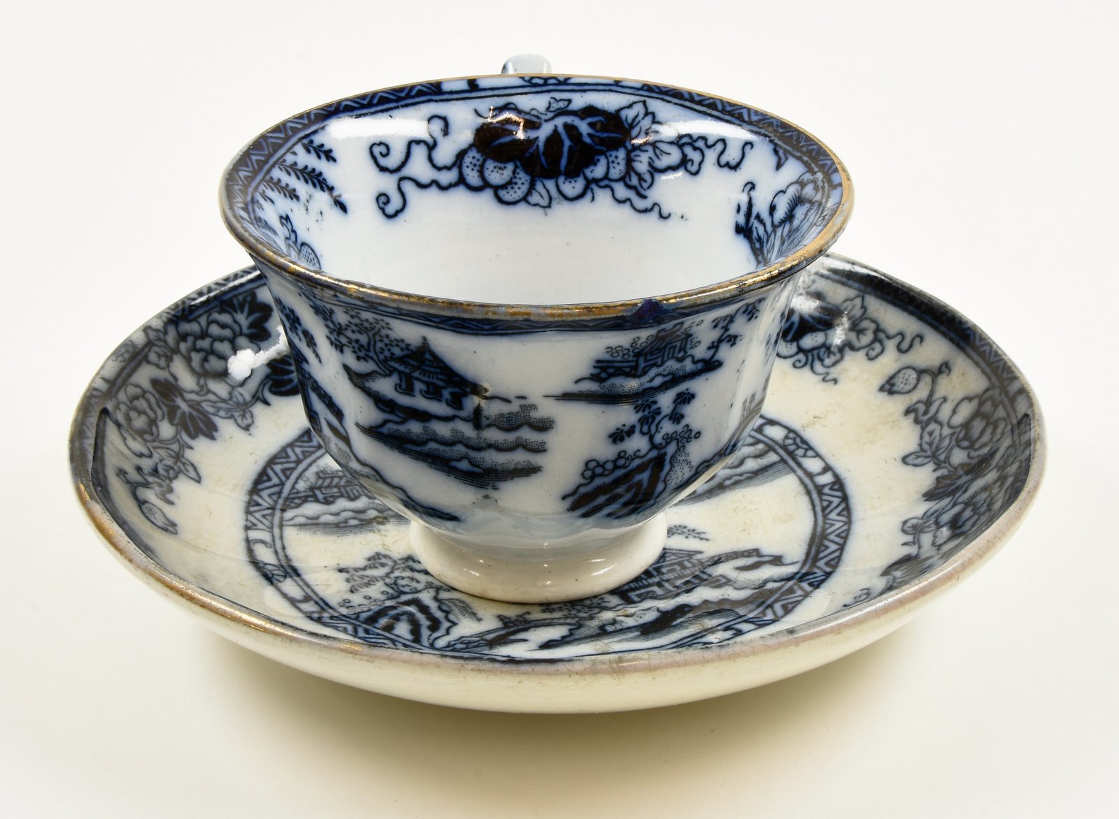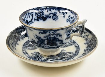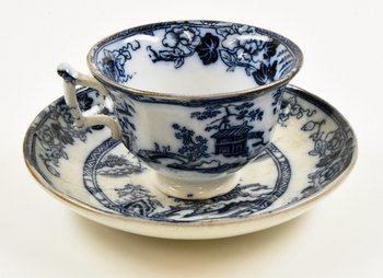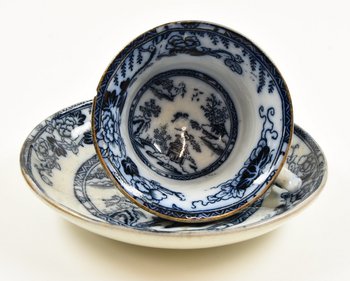 | Description | Tasse mit Untertasse, weiß glasiert, Tasse außen und Rand innen sowie UT oben blau bemalt mit Pflanzen und chinesischen Landschaftsmotiven, unterseitig blaue Marke "HONGKONG". |