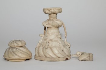 | Description | Teile eines mit Schnitzarbeiten in Form von Punkten, Tieren und Menschen verzierten Gefäßes aus Elfenbein. |