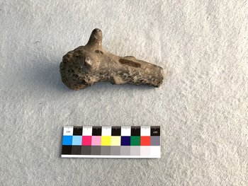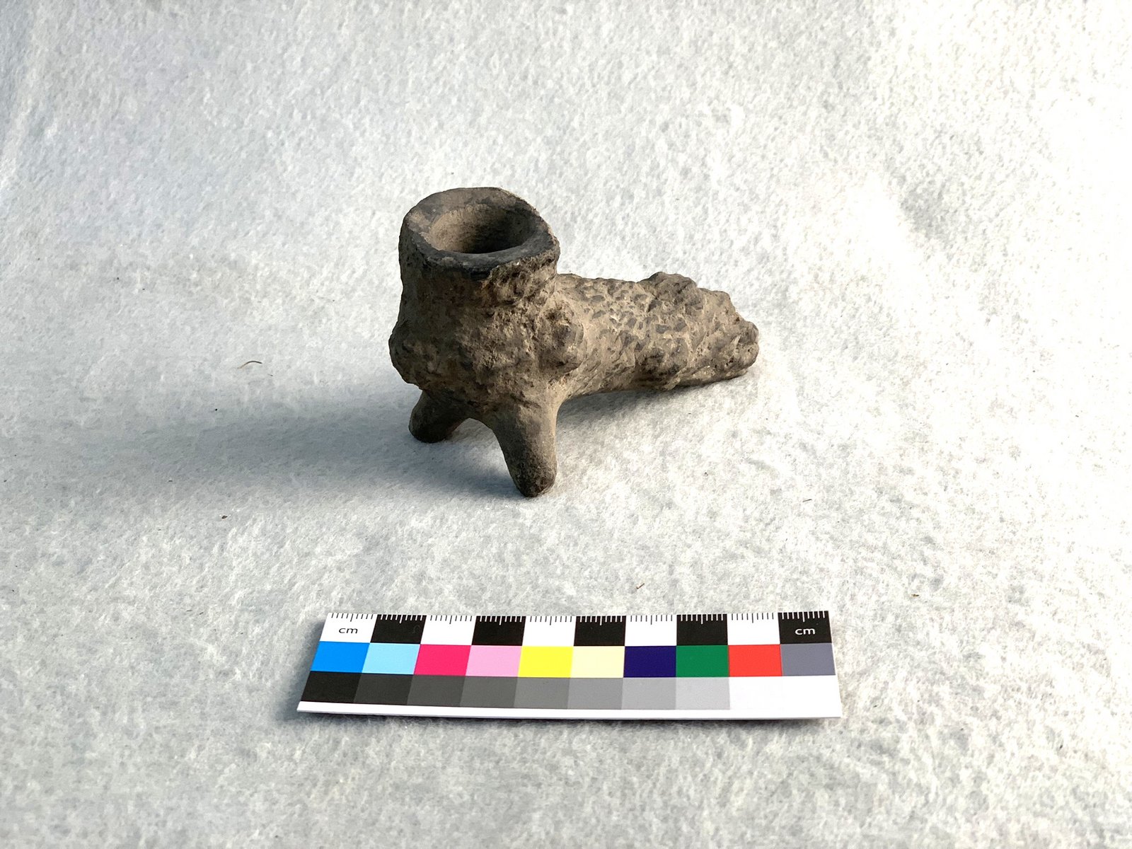 | Description | Tonware, vermutlich ein Pfeifenkopf. Wellenartige Struktur auf manchen Seiten. Zwei Füße, vorne Öffnung nach oben. |