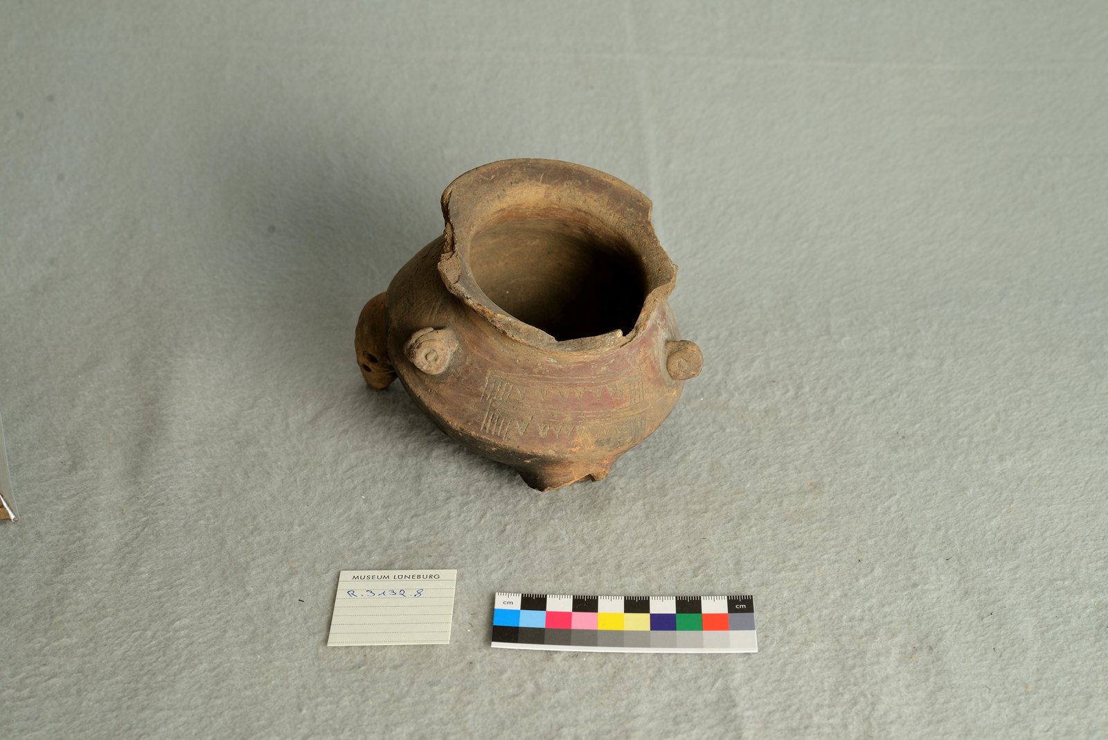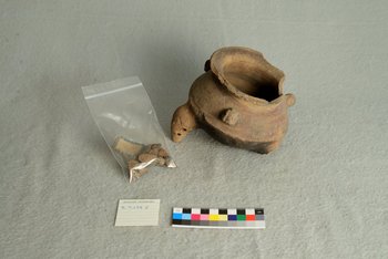 | Description | Tongefäß, zusätzliche Fragmente in Tüte beiliegend. Von ehemals drei Füßen sind zwei abgebrochen, in drittem Löcher. Ausbeulungen und Verzierungen mit Linien und Dreiecken an den Seiten. Unten schwarze Stellen. |