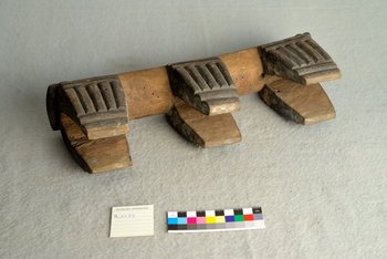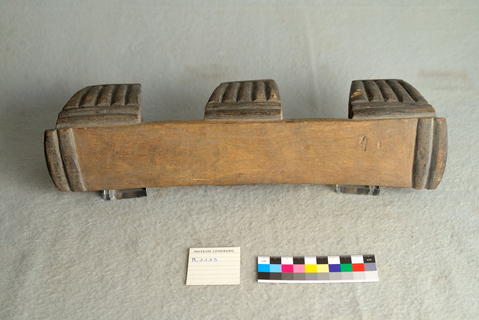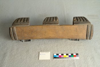 | Description | Schmale Kopfstütze aus Holz mit sechs Beinen und Schnitzverzierungen. Oben Aufschrift mit Beistift: "Geschenk von Alstein/1883". Eine exakte kulturelle Zuschreibung konnte nicht vorgenommen, aber auf die beiden angegebenen eingegrenzt werden. |