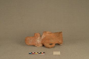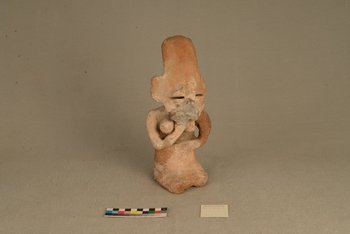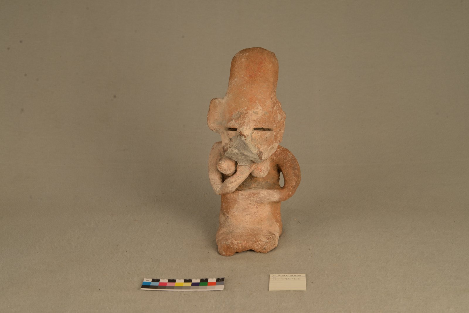 | Description | Weibliche Tonfigur. Linkes Ohr und ein Stück des Gesichts abgebrochen und fehlend. Hohe Stirn. Linke hand liegt auf dem Bauch, rechte Hand zum Gesicht gehoben. |