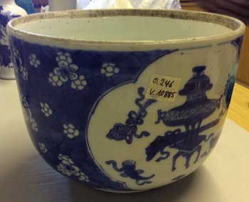 | Description | Topf, Unterglasurkobaltblau, in zwei Feldern bemalt mit Prunusblüten, ausgespart aus "geborstenem Eis"; dazwischen Kartuschen mit Gegenständen des "vornehmen Lebens". Am Boden: blauer Doppelkreis. Das Objekt ist im Katalog durch Ohlmers Sammlung unter der Nr. 246 (1932) und Nr. 16 (1898 Blauweiß) zu finden. |