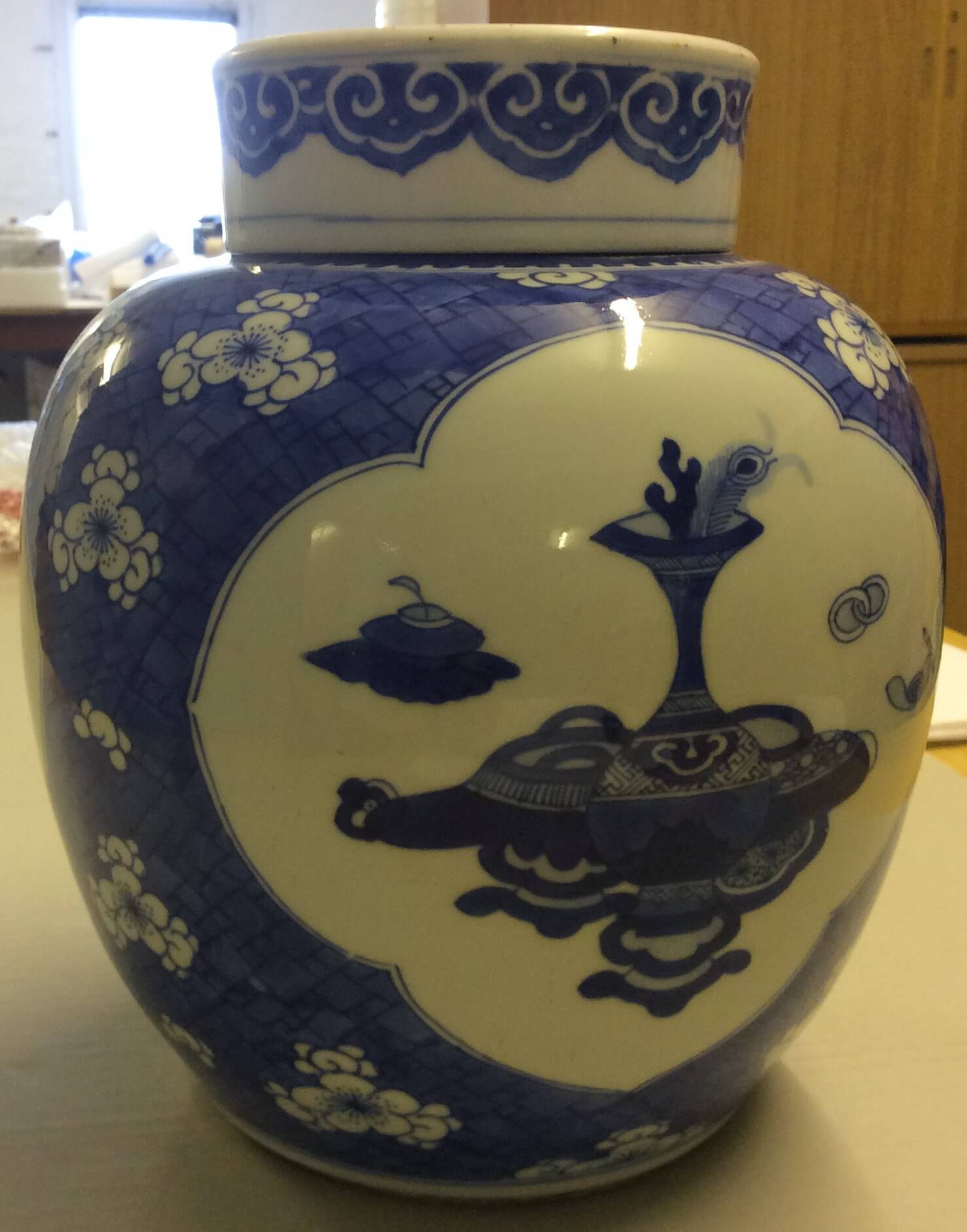 | Description | Qing-Dynastie (1644-1911); Kobaltblaue Unterglasurbemalung, 3 Kartuschen mit Gegenständen des vornehmen Lebens in Feld von "geborstenem Eis" und Prunusblüten; Halsrand mit Zinnen. Das Objekt ist im Katalog durch Ohlmers Sammlung unter der Nr. 215 (1932) und Nr. 13 oder 14 (1898 Blauweiß) zu finden. |