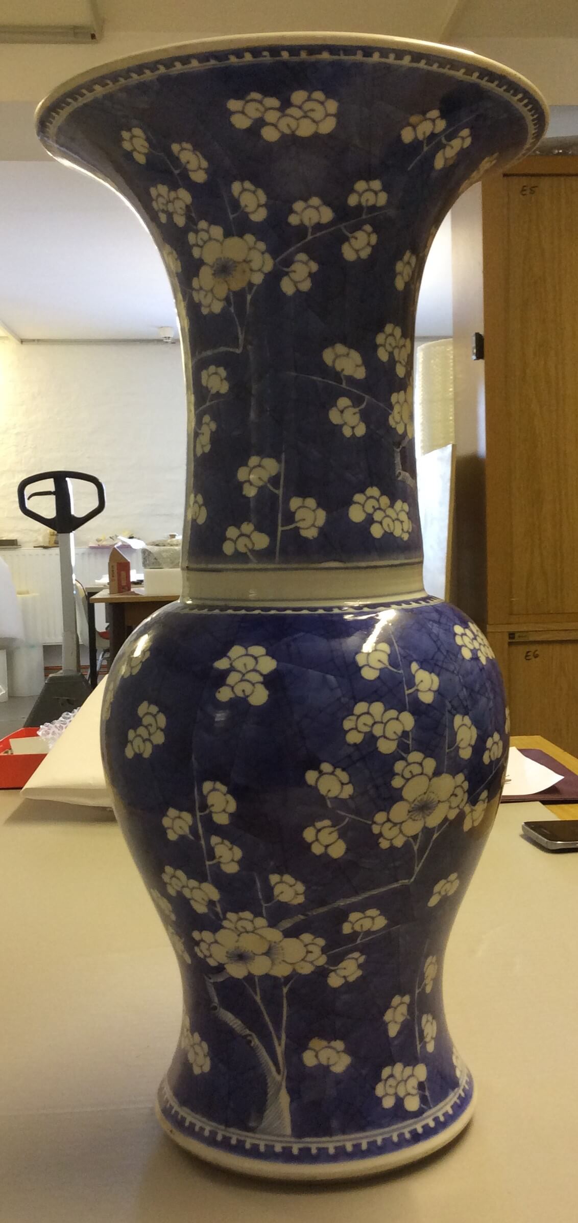 | Description | Qing-Dynastie (1644-1911); Unterteil bauchig (Balusterform), Oberteil trompetenförmig (mit weit ausgeschwungener Lippe), in tiefem Kobaltblau unter der Glasur bemalt mit Prunusblüten, ausgespart aus geborstenem Eis (Symbol des Frühlings). Am Boden: Blauer Doppelkreis. Das Objekt ist im Katalog durch Ohlmers Sammlung unter der Nr. 236 (1932) und Nr. 3 oder 4 (1898 Blauweiß) zu finden. |