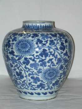 | Description | Qing-Dynastie (1644-1911), Kangxi-Marke und -Periode (1662-1722); Mit bauchiger Wandung und breiter Schulter, die in einen niedrigen Hals mit umgebogener Lippe übergeht. Der Dekor ist in mattem, flächig laviertem Unterglasurblau gemalt: Auf der Wandung dichte Ranken mit großen Chrysanthemenblüten, die sich in einem Band auf der Schulter wiederholen; auf dem Hals und oberhalb des Fußrings ein Blattkranz. Die Sechs-Zeichen-Marke ohne einen Doppelring ist in Unterglasurblau auf die Basis geschrieben. Das Objekt ist im Katalog durch Ohlmers Sammlung unter der Nr. 205 (1932) und Nr. 42 (1898 Blauweiß) zu finden. |