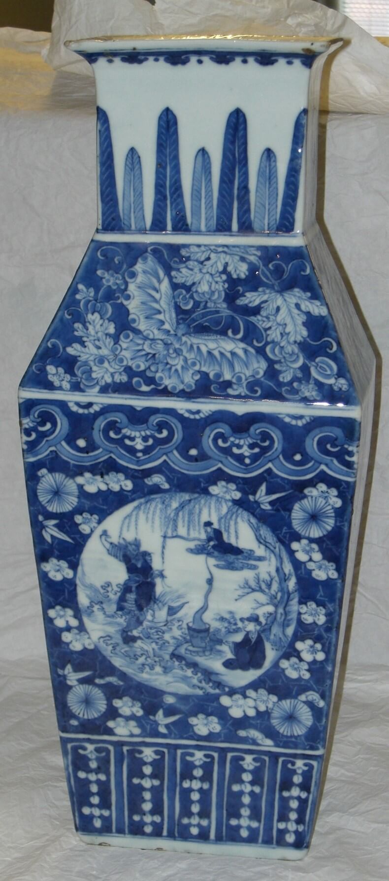| Description | Qing-Dynastie (1644-1911); Hohe vierkantige Vase, in Unterglasurkobaltblau bemalt mit aus blauem Grund ausgesparten Prunusblüten und zwei Medaillons mit Opferszenen und Göttererscheinungen. Oben Schmetterlinge, Blumen und hohe Blattzacken. Das Objekt ist im Katalog durch Ohlmers Sammlung unter der Nr. 138 (1932) und Nr. 136 (1898 Bunt) zu finden. |
