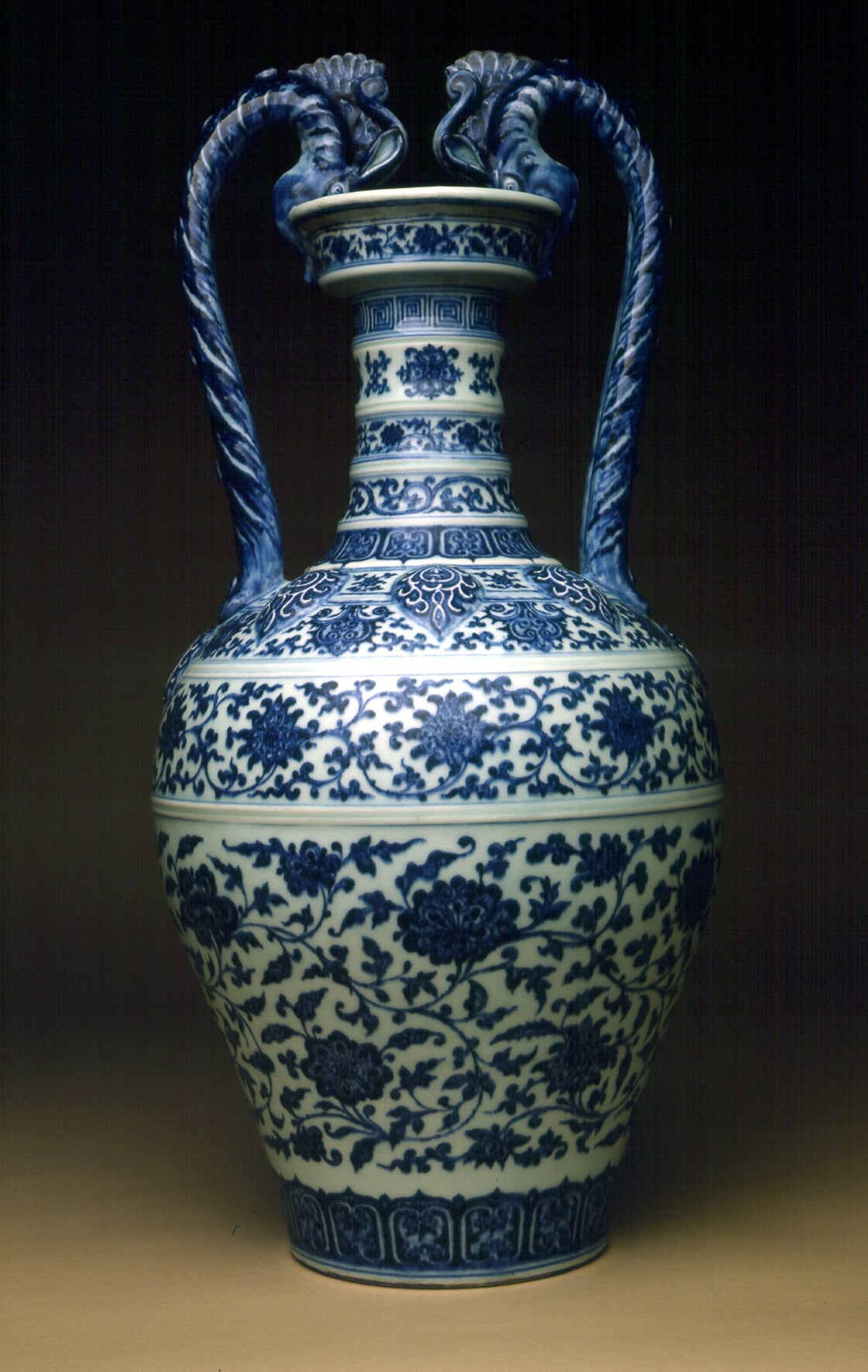 | Description | Amphore mit gebrauchter Wandung, breiter Schulter und hohem schlanken Hals, der in eine ausladende becherförmige Mündung mit schräg nach außen gestellter Lippe übergeht. In die Lippe sind von zwei Seiten Drachen verbissen, deren gewundene zweiteilige Körper die hochgeschwungenen Henkel des Gefäßes bilden und auf der Schulter aufsitzen. Der gesamte Gefäßkörper einschl. des Halses ist horizontal durch Profile in verschieden breite Bänder gegliedert; auf der Schulter Appliquen. Bemalung in Unterglasurblau - Nachahmung des "heaped and piled"-Effekts des frühen 15. Jh.: die einzelnen horizontalen Bänder mit Blütenranken, Arabesken, einzelnen Blüten und Mäandern sowie einem blaugrundigen Lotosblattkranz am Fuß und auf der Schulter; Drachen und Appliquen ebenfalls blaugrundig. Die Sechs-Zeichen-Siegelmarke ist in Unterglasurblau auf die eingetiefte Basis geschrieben. (UW) Gefäßkörper mit Henkeln zeigt typisch islamisch-persischen Einfluss, wie er sich in der Tang-Zeit (618-907) manifestierte. Die Amphore stellt die interessante und neue Verbindung von Blauweiß-Dekor in Art des frühen 15. Jh. mit dieser frühen Gefäßform dar. Die Töpfer der Yongzheng-Periode müssen dieses tangzeitliche Vorbild sehr genau gekannt haben, wie auch kleine Details, etwa die gewundenen, zweigeteilten Drachenköpfe mit Knöpfen in regelmäßigen Abständen und die Appliquen auf der Schulter zeigen. Ein Gegenstück findet sich in der "T.T. Tsui Gallery of Chinese Art" im Victoria & Albert Museum London. (UW/HB) Das Objekt ist im Katalog durch Ohlmers Sammlung unter der Nr. 235 (1932) und Nr. 48 (1898 Blauweiß) zu finden. |