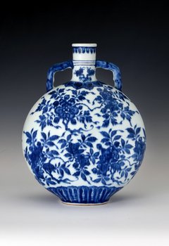 | Description | Qing-Dynastie (1644-1911); Mit runder, zu zwei Schauseiten abgeflachter Form über einem ovalen, nicht abgesetzten Fußring und mit einem schmalen, zylindrischen Hals, der durch zwei gekrümmte Henkel mit der Schulter verbunden ist. Der Dekor ist in verwischtem Unterglasurblau gemalt: Auf der Wandung, zwischen einem blaugrundigen Blattkranz unten und oben, auf jeder Seite ein Orangen-, ein Pfirsich- und ein Granatapfelzweig, auf der einen Seite mit Blüten zu Beginn des Wachstums, auf der anderen Seite mit Früchten; auf dem durch ein Profil in Höhe der Henkel gegliederten Hals je zwei Lingzhi-Pilze unten und ein Zahnschnittmuster oben. Ursprünglich Sammlung Ernst Ohlmer. Eine ähnliche Pilgerflasche, ebenfalls ohne Marke, befindet sich im National Palace Museum ( Blue-and-White Ware of the Ch'ing Dynasty, II, Tafel 16). Zwar ist bei diesem Beispiel das Unterglasurblau nicht so verwischt, doch ist nicht ganz auszuschließen, daß bei dem Hildesheimer Stück ein beabsichtigter Effekt erzielt werden sollte, wie er gelegentlich auch auf Beispielen des frühen 15. Jahrhunderts erscheint. Form und Dekor beziehen sich auf Vorbilder dieser Zeit. Im 18. Jahrhundert scheint es ein beleibtes Motiv gewesen zu sein, blühende und Früchte tragende Zweige gegeneinander zu stellen ( siehe Beispiele der Yongzheng-Periode, 1723- 1735; Blue-and-White Ware of the Ch'ing Dynasty, I, Tafel 2,5,11), das aber bereits in der frühen Ming-zeit ausgebildet war. Das Objekt ist im Katalog durch Ohlmers Sammlung unter der Nr. 293 (1932) und Nr. 43 (1898 Bunt) zu finden. |