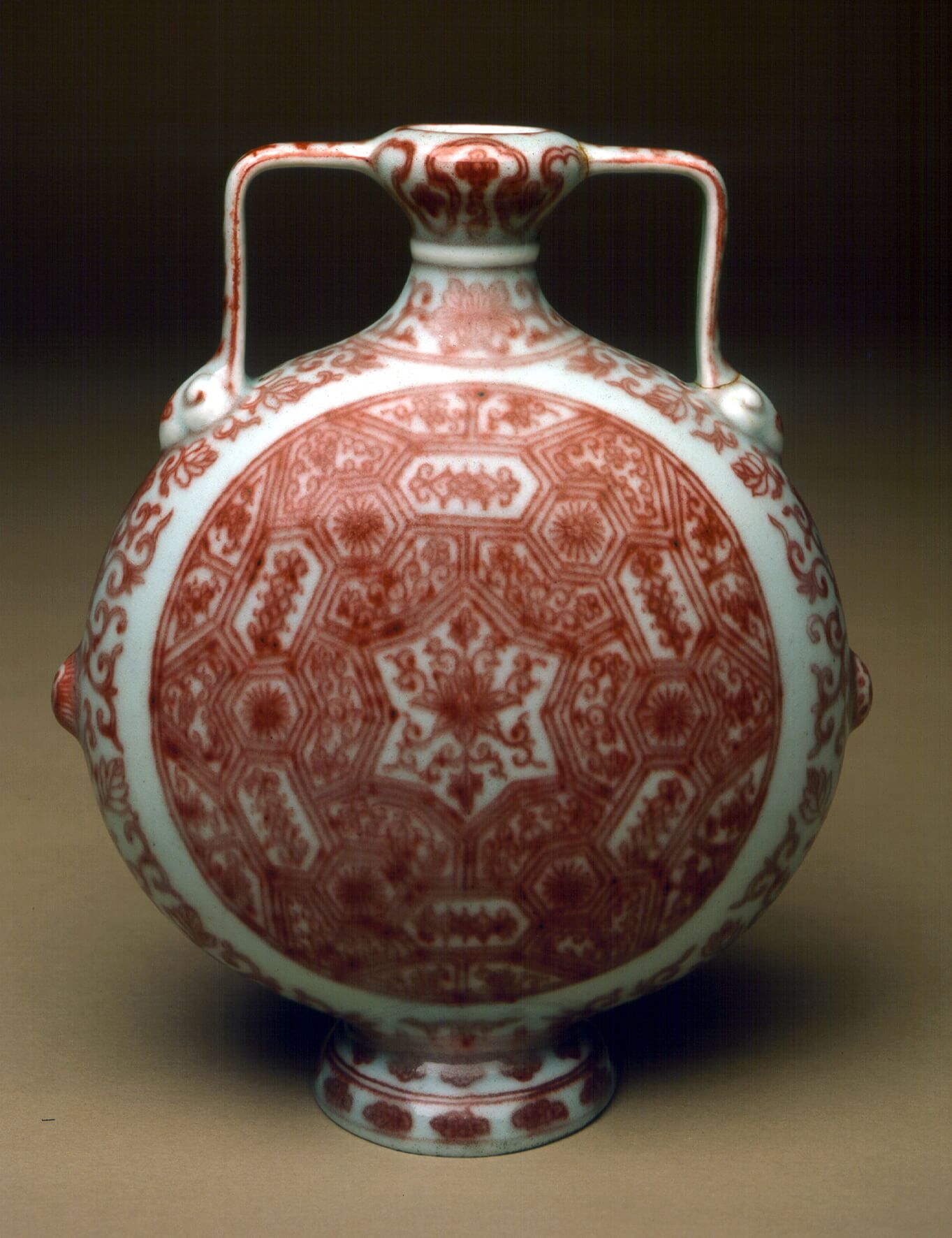 | Description | Über einem gewölbten Fußring, mit runder, zu zwei Schauseiten abgeflachter Gefäßform, die in einem eingeschnürten Hals mit becherartig geweiteter Mündung und nach innen gestellter Lippe übergeht; mit zwei weiten, eckig gebogenen Henkeln, die auf der Schulter in Ruyi-Köpfen enden. Der Dekor ist in Unterglasurrot gemalt: Auf jeder Seite der Wandung ein großes Medaillon, in das, ausgehend von einem sechseckigen Stern in der Mitte, ein kleingliederiges geometrisches Muster eingepaßt ist, dessen einzelne Felder wiederum Rahmen für stilisierte Blumen und Ranken bilden; auf den Schmalseiten eine formalisierte Blütenranke, die sich in einem Band am Halsansatz wiederholt, und an der Mündung ein "Wolkenkragen"-Muster.Die Sechs-Zeichen-Siegelmarke ist in Unterglasurblau auf die Basis geschrieben. Ursprünglich Sammlung Ernst Ohlmer. Weitere Beispiele befinden sich in der Baur Collection (Ayers, Chinese Ceramics, IV, Kat. Nr. A 535) und im Gulbenkian Museum ( Legeza, Malcom Macdonald Collection, Kat.Nr. 220; siehe auch Jenyns, Later Chinese Porcelain, Tafel 86, der dieses unterglasurrote Stück neben ein Beispiel dieses Typus in Überglasurrot stellt). Diese Pilgerflaschen beziehen sich auf ein Vorbild des frühen 15. Jahrhunderts (Pope, An Early Ming Porcelain in Muslim Style, in: Aus der Welt der islamischen Kunst. Festschrift für Ernst Kühnel, Berlin 1959; mit einer Darstellung der Bedeutung des Dekors). Das Beispiel in Unterglasurblau im National Palace Museum, das dort in die Yongle-Periode, 1403- 1424 datiert wird ( Blue-And-White Ware of the Ming Dynasty, I, Tafel 6), stammt nach Ayers möglicherweise erst aus der Qing-Zeit (Chinese cermaics, IV, Kat. Nr. A 535). Das Objekt ist im Katalog durch Ohlmers Sammlung unter der Nr. 157 (1932) und Nr. 91 (1898 Bunt) zu finden. |