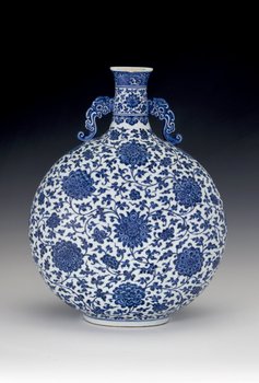 | Description | Qing-Dynastie (1644-1911); Mit runder, zu zwei Schauseiten abgeflachter Form, die in einen schmalen Hals mit nach außen schwingender Lippe übergeht, der durch zwei Henkel in Form von Elefantenköpfen mit der Schulter verbunden ist; abgesetzter, ovaler Fußring. Der Dekor ist in Unterglasurblau gemalt: Auf der Wandung umlaufend eine reich verzweigte Blätteranke mit großen Blüten verschiedener Herkunft, die je um ein Zentrum geordnet sind; am Hals je ein Lotosblütenzweig, eingefaßt von einem blaugrundigen, umlaufenden "Wolkenkragen"-Band unten und einem Wellenmuster oben. Ursprünglich Sammlung Max von Brandt. Die Pilgerflasche greift Vorbilder des frühen 15. Jahrhunderts auf. Das Objekt ist im Katalog durch Ohlmers Sammlung unter der Nr. 282 (1932) und Nr. 49 (1898 Blauweiß) zu finden. |