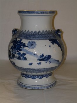 | Description | Breites, bauchiges Gefäß im Typus der archaischen Kultbronze Hu, mit ausschwingendem, hohem, abgesetztem Fuß und einer hochgestellten Lippe analog dem Fußring; auf der Schulter zwei applizierte Löwenköpfe. Der Dekor ist in einem kräftigen Unterglasurblau gemalt: Auf der Wandung ein dichtes "Fischschuppenmuster" mit zwei breiten Reserven, die eine mit Henne und Küken in einer Landschaft mit Spinnwebennetz, die andere mit einer Seelandschaft und zwei Anglern und nicht lesbaren Siegeln; ferner sind ausgespart je ein weißgrundiger Hase unterhalb der Löwenköpfe. Diese Zone wird eingefaßt von ornamentalen Bändern oben und unten; am Fußring und an der Lippe Dreiecksmuster und am Fußansatz ein Ruyi-Band. Die siegelartige Fu-Marke ist in einem zusätzlich in die Basis eingetieften Feld innerhalb eines Doppelrings in Unterglasurblau geschrieben. Die Verwendung einer Fu-Marke auf Kangxi-Porzellanen ist ungewöhnlich. Interessant ist die Verwendung von Siegeln auf einem der Bilder der Reserven, die als Vorlage eine Bildrolle nahelegen sollen Das Objekt ist im Katalog durch Ohlmers Sammlung unter der Nr. 207 (1932) und Nr. 22 (1898 Blauweiß) zu finden. |