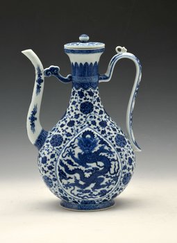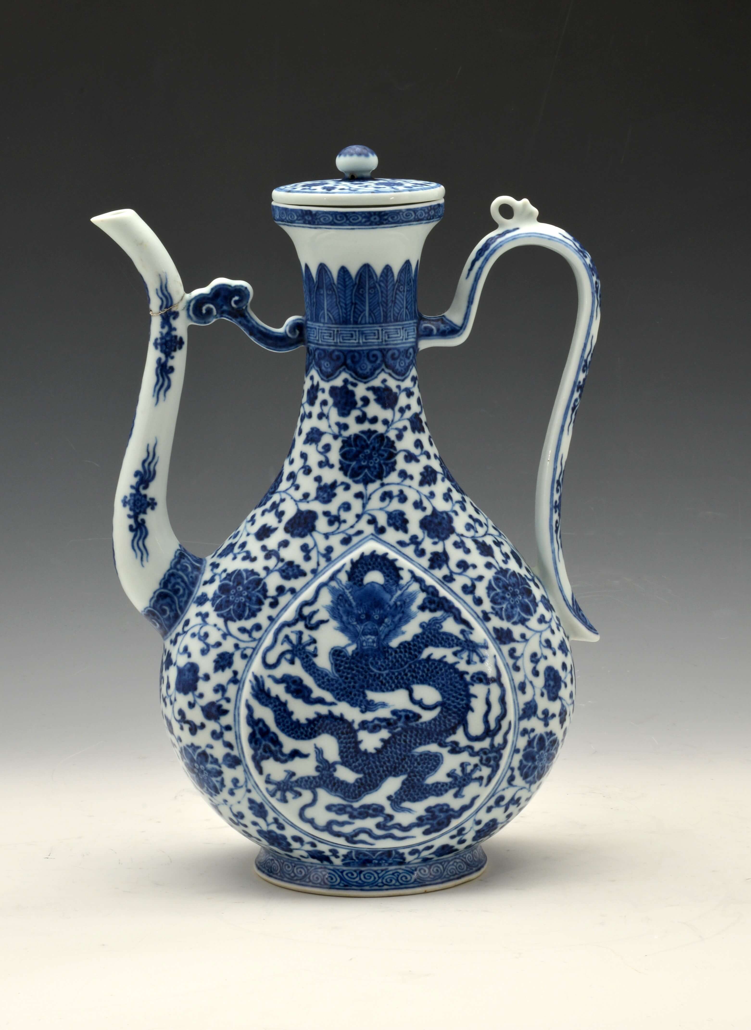 | Description | Qing-Dynastie (1644-1911); Mit birnenförmigem, zu zwei Schauseiten mit je einer erhabenen Reserve abgeflachtem Gefäßkörper, der in einen hohen Hals mit nach außen schwingender, becherförmiger Mündung mit hochgestellter Lippe übergeht; Tülle und hals durch einen Steg in Form eines Lingzhi-Pilzes in der Höhe verbunden, in der auch der schleifenförmig nach oben geschwungene Henkel ansetzt. Dieser hat oben eine Ringöse, an der der flache Deckel mit Knauf befestigt werden kann. Der Dekor ist in Unterglasurblau gemalt: Auf der Wandung je eine tropfenförmige Reserve mit einem fünfklauigen Drachen. gerahmt von einer Doppellinie; der übrige Gefäßkörper überzogen mit einem dichten Blütenrankendekor bis hinauf zum Hals, der mit einem Mäander zwischen blaugrundigem Ruyi-Band unten und dichtem Blattkranz oben ausgezeichnet ist; die hochgestellte Lippe mit einer "Klassischen Ranke", die sich auf dem Fußring weiderholt.