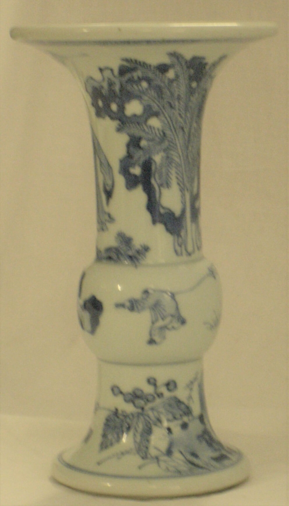 | Description | Qing-Dynastie (1644-1911), Kangxi-Periode (1662-1722); Mit schlankem Gefäßkörper im Typus der archaischen Kultbronze Gu, mit weitausschwingender Mündung und Fuß, gegliedert durch eine niedrige gebauchte Mitte. Dickwandiger Scherben. Der Dekor ist in Unterglasurblau gemalt: Auf der gebauchten Mitte spielende Kinder, die einen Drachen steigen lassen; unten Felsen, Bambus und Beerenzweige; oben eine Gartenlandschaft mit Mond und drei Personen unter einem Kirschblütenzweig sowie ein Spinnennetz; unterhalb der Lippe ein Band mit geborstenem Eis. Eingetiefte, glasierte Basis. Das Objekt ist im Katalog durch Ohlmers Sammlung unter der Nr. 225 (1932) und Nr. 64 (1898 Blauweiß) zu finden. |